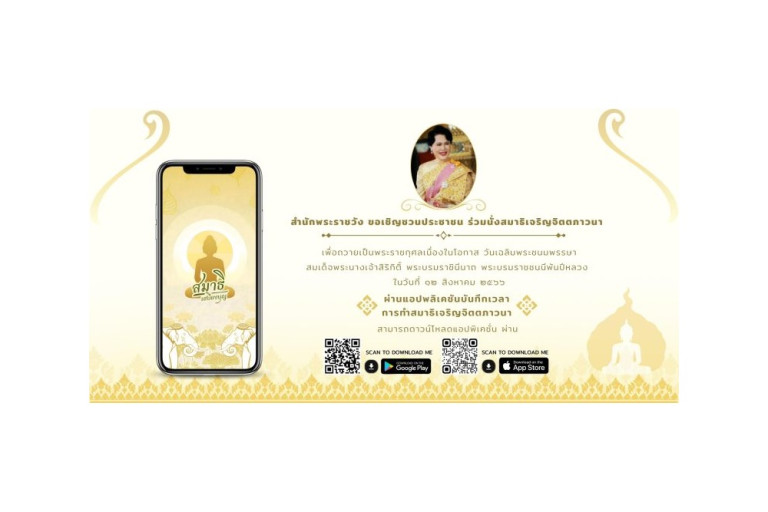 สำนักพระราชวัง ขอเชิญชวนประชาชนร่วมนั่งสมาธิเจริญจิตตภาวนา เพื่อถวายเป็นพระราชกุศลเนื่องในโอกาสวันเฉลิมพระชนมพรรษา สมเด็จพระนางเจ้าสิริกิติ์ พระบรมราชินีนาถ พระบรมราชชนนีพันปีหลวง วันที่ ๑๒ สิงหาคม ๒๕๖๖ ผ่านแอปพลิเคชัน “สมาธิเสบียงบุญ” บันทึกเวลาการทำสมาธิเจริญจิตตภาวนา ตั้งแต่วันที่ ๑ สิงหาคม ๒๕๖๖ เวลา ๐๘.๐๐ น. ถึง วันที่ ๑๒ สิงหาคม ๒๕๖๖ เวลา ๐๘.๐๐ น. ทั้งนี้ สามารถ ดาวน์โหลดแอปพลิเคชันได้ทั้ง Play Store และ App store