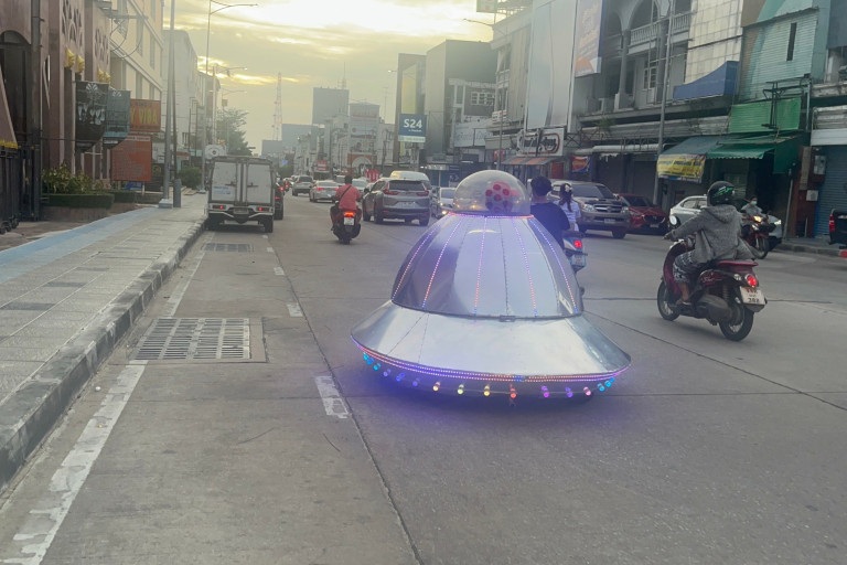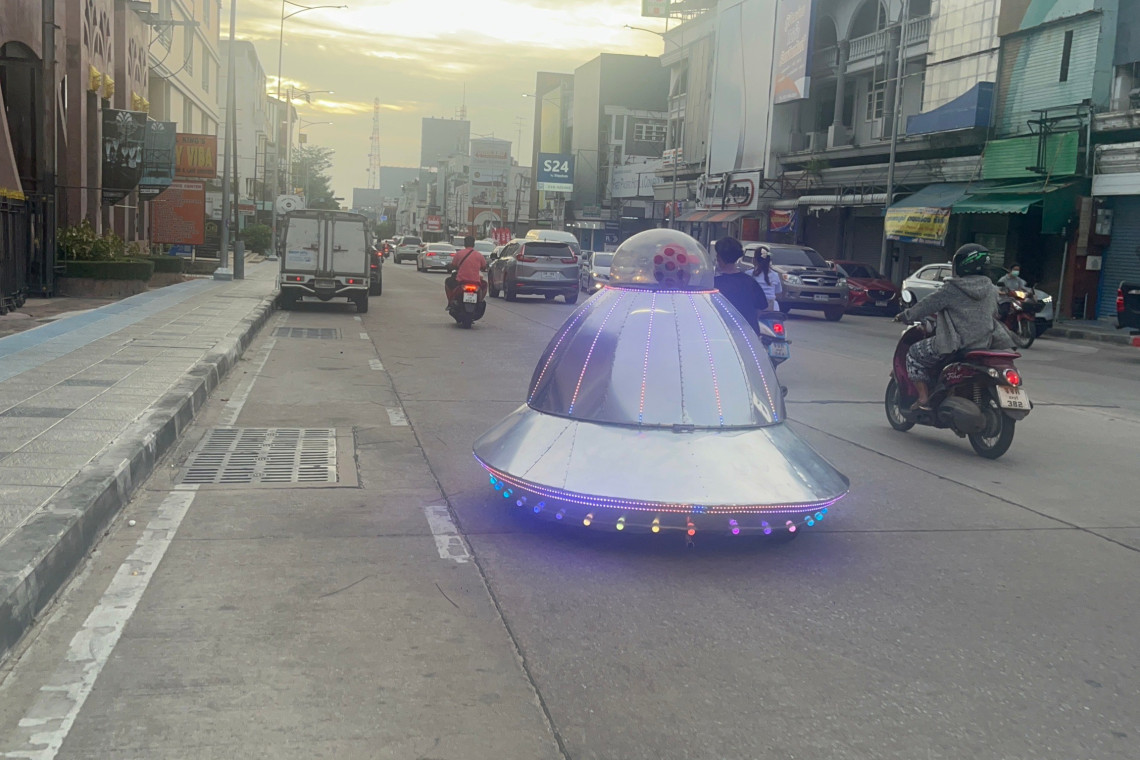 ซึ่งผู้สื่อข่าวลงพื้นที่บริเวณดังกล่าว ตามที่เพจข่าวโพสต์ ก็พบจานบิน UFO วิ่งอยู่ตามถนนซึ่งสร้างรอยยิ้มและสีสันให้กับชาวบ้านที่ได้พบเห็น ส่งเสริมการท่องเที่ยวผู้สื่อข่าวจึงตามไปจนถึงจุดหมาย จนทราบว่าคนที่ขี่จานบิน UFO ไปถามถนนในเมืองพัทยาคือ ป๋าหนู วัย 63 ปี ที่เคยสร้างความฮือฮาในปี พ.ศ. 2563 หลังป๋าหนูขับขี่จักรยานยนต์ขนาดเล็ก ที่แต่งเป็นลักษณะพาหนะของพ่อมด ตกแต่งเป็นรูปทรงไม้กวาด ติดไฟประดับอย่างมีมนต์ขลัง ขี่โบกมือทักทายกับนักท่องเที่ยวที่อยู่บริเวณนั้น สร้างสีสันรอยยิ้มให้กับผู้พบเห็นเป็นอย่างมาก