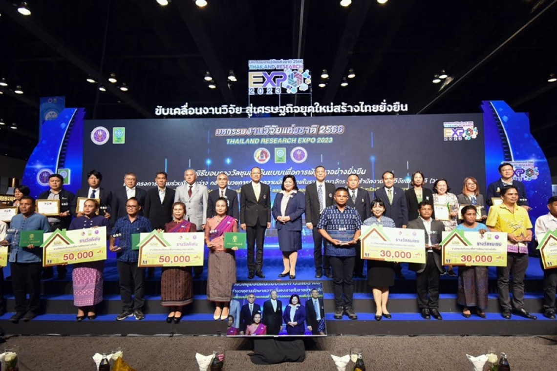 เมื่อวันที่ 7 ส.ค.66 สำนักงานการวิจัยแห่งชาติ (วช.) กระทรวงการอุดมศึกษา วิทยาศาสตร์ วิจัยและนวัตกรรม ร่วมกับ กองอำนวยการรักษาความมั่นคงภายในราชอาณาจักร (กอ.รมน.) จัดพิธีมอบรางวัล “ชุมชนต้นแบบเพื่อการพัฒนาอย่างยั่งยืนด้วยผลงานวิจัยและนวัตกรรม” ซึ่งเป็นการขยายผลความสำเร็จของการพัฒนาพื้นที่ชุมชนสังคมด้วยวิจัยและนวัตกรรม ภายใต้บันทึกข้อตกลงความร่วมมือการใช้ประโยชน์องค์ความรู้จากผลงานวิจัยและนวัตกรรมเพื่อการพัฒนาเชิงพื้นที่ : ชุมชนเข้มแข็งด้วยวิจัยและนวัตกรรม ระหว่าง วช. และ กอ.รมน. โดยมี ดร.วิภารัตน์ ดีอ่อง ผู้อำนวยการสำนักงานการวิจัยแห่งชาติ และ พลโท วิกร เลิศวัชรา รองเลขาธิการกองอำนวยการรักษาความมั่นคงภายในราชอาณาจักร เป็นประธานมอบรางวัลฯ ณ เวที Highlight Stage ในงาน “มหกรรมงานวิจัยแห่งชาติ 2566 : Thailand Research Expo 2023” ชั้น 22 โรงแรมเซ็นทาราแกรนด์ และบางกอกคอนเวนชันเซ็นเตอร์ เซ็นทรัลเวิลด์ กรุงเทพมหานคร