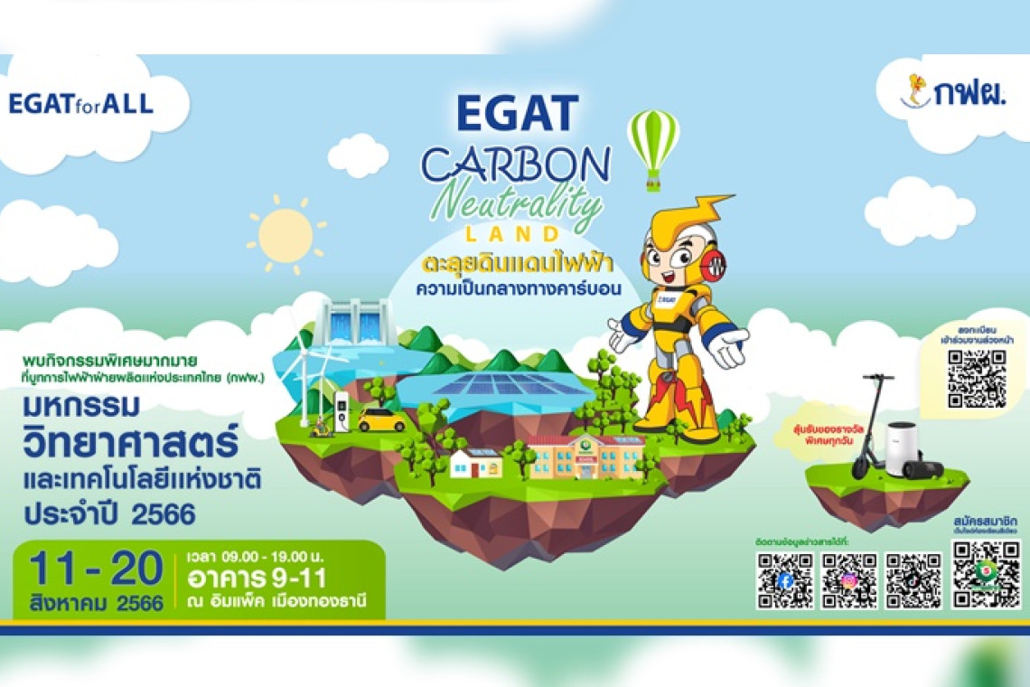 การไฟฟ้าฝ่ายผลิตแห่งประเทศไทย (กฟผ.) เตรียมเปิดบูท “EGAT Carbon Neutrality Land: ตะลุยดินแดนไฟฟ้า ความเป็นกลางทางคาร์บอน” เชิญชวนเหล่านักผจญภัยรุ่นจิ๋วมาตะลุยดินแดนไฟฟ้าที่มุ่งสู่ความเป็นทางคาร์บอน ฝ่าภารกิจผลิตไฟฟ้าด้วยโซลาร์เซลล์ลอยน้ำไฮบริดเขื่อนสิรินธรขนาดใหญ่ที่สุดในโลก ผจญภัยด้วยยานยนต์ไฟฟ้าแห่งอนาคต พร้อมร่วมสะสมไอเท็มประหยัดพลังงาน และพิชิตคาร์บอนตัวร้ายผ่านโครงการปลูกป่าอย่างมีส่วนร่วม