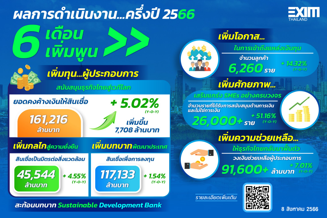 EXIM BANK แถลงผลการดำเนินงานครึ่งแรกปี 2566 เพิ่มทุนผู้ประกอบการไทยเพิ่มขึ้น 5.02% จากช่วงเดียวกันของปีก่อน นำไปสู่ยอดคงค้างสินเชื่อ 161,216 ล้านบาท โดยเพิ่มบทบาทพัฒนาประเทศด้วยสินเชื่อการลงทุนที่เป็นสัดส่วน 73% หรือ 117,133 ล้านบาท และเพิ่มกลไกความยั่งยืนสู่สินเชื่อสนับสนุนธุรกิจที่เป็นมิตรกับสิ่งแวดล้อมเป็น 28% หรือ 45,544 ล้านบาท รวมทั้งเพิ่มโอกาสในการเข้าถึงแหล่งเงินทุนแก่ผู้ประกอบการทุกขนาด ส่งผลให้มีจำนวนลูกค้าเพิ่มเป็น 6,260 ราย นอกจากนี้ ได้เพิ่มศักยภาพผู้ประกอบการไทยทั้งด้านการเงินและไม่ใช่การเงินสะสมรวมกว่า 26,000 ราย โดยเพิ่มความช่วยเหลือเป็นวงเงินรวมกว่า 91,600 ล้านบาท