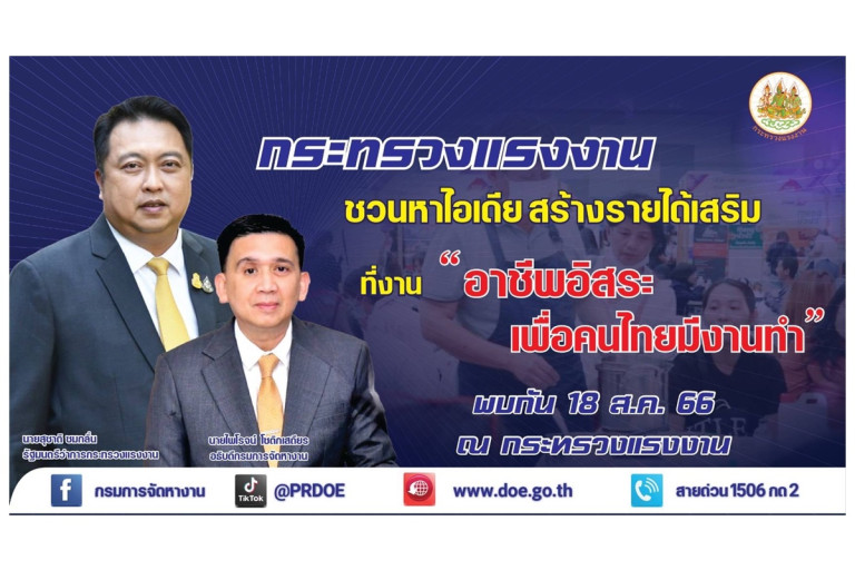 ทั้งนี้ ขอเชิญนักเรียน นักศึกษา และประชาชนทุกคนที่กำลังมองหาไอเดียในการประกอบอาชีพอิสระ ร่วมงาน “อาชีพอิสระ เพื่อคนไทยมีงานทำ” ที่จะจัดขึ้น ณ อาคารกระทรวงแรงงาน ถนนมิตรไมตรี แขวงดินแดง เขตดินแดง กรุงเทพมหานคร ในวันที่ 18 สิงหาคม 2566 หากต้องการสอบถามรายละเอียดเพิ่มเติมติดต่อที่สายด่วนกระทรวงแรงงาน โทร 1506 กด 2 กรมการจัดหางาน