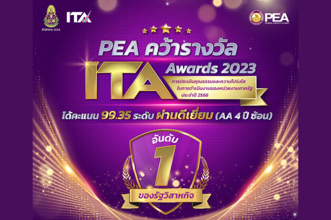 การไฟฟ้าส่วนภูมิภาค (PEA) คว้ารางวัลประกาศเกียรติคุณเชิดชูเกียรติ ITA Awards 2023 ได้รับผลคะแนนการประเมินคุณธรรมและความโปร่งใสในการดำเนินงานของหน่วยงานภาครัฐ (ITA) 99.35 คะแนน “ผ่านดีเยี่ยม” สูงที่สุดอันดับ 1 ในกลุ่มรัฐวิสาหกิจ และได้คะแนนในระดับ AA ต่อเนื่อง 4 ปีซ้อน จากหน่วยงานภาครัฐที่เข้ารับการประเมิน 8,303 หน่วยงานทั่วประเทศ สะท้อนการเป็นหน่วยงานรัฐวิสาหกิจชั้นนำ มุ่งเน้นการให้บริการที่เป็นเลิศกับผู้มีส่วนได้ส่วนเสีย ตอบสนองต่อความต้องการของลูกค้า ประชาชนและบุคลากรภายในองค์กรอย่างต่อเนื่อง