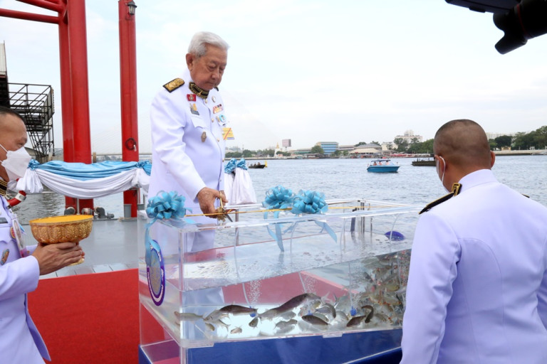 และประพรมน้ำพระพุทธมนต์ที่ตู้ปลา ปล่อยพันธุ์ปลาน้ำจืด จำนวน 1,000,000 ตัว ซึ่งกรมประมงน้อมเกล้าน้อมกระหม่อมถวาย ประกอบด้วย ปลาตะเพียนขาว ปลาตะเพียนทอง ปลายี่สกไทย ปลาแก้มช้ำ ปลาสร้อยขาว ปลากระแห ปลาโพง ปลาเทโพ และปลาชะโอน ลงแม่น้ำเจ้าพระยา เพื่อให้เจริญเติบโตรักษาความสมดุลตามระบบนิเวศน์ และเพาะขยายพันธุ์ตามธรรมชาติต่อไป