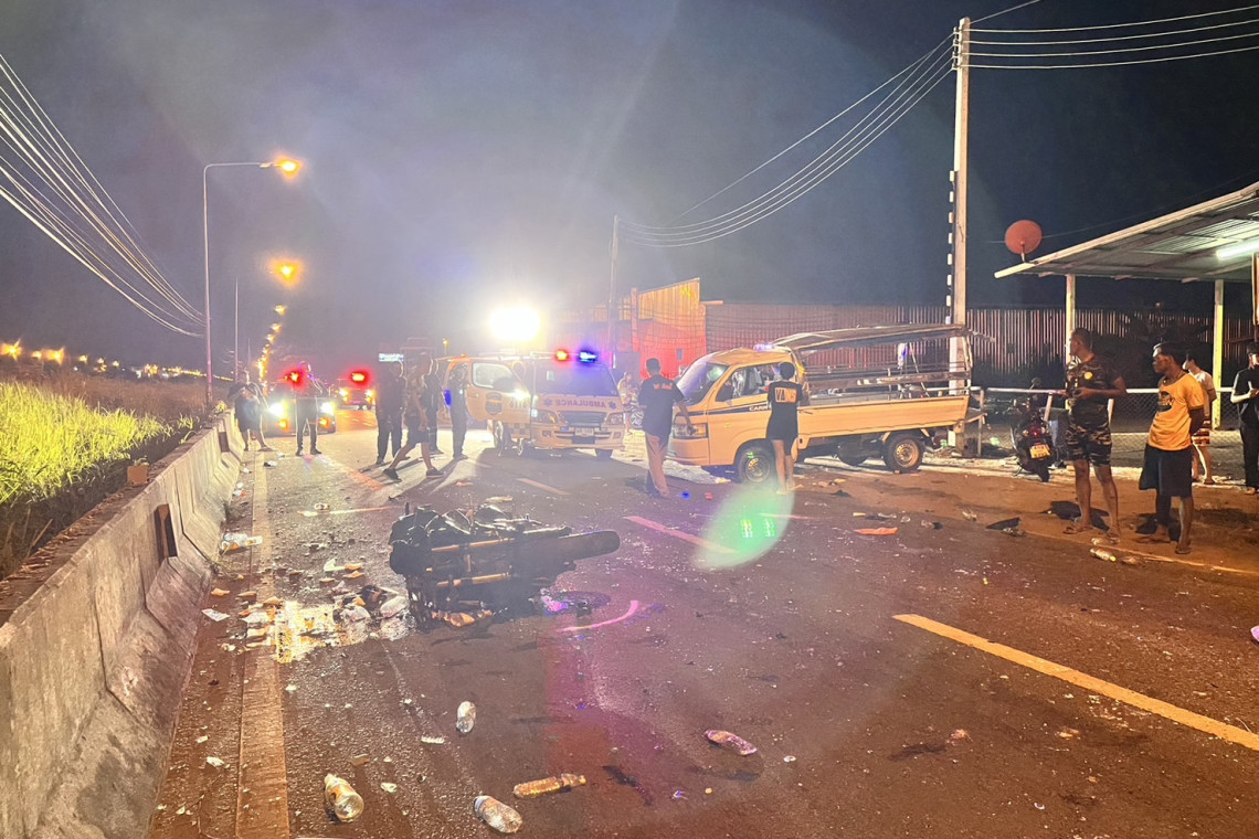 ที่เกิดเหตุพบผู้บาดเจ็บ นอนได้รับบาดเจ็บหลายราย นอนรอความช่วยเหลือบนพื้นถนน รวมทั้งสิ้นจำนวน 8 ราย เสียชีวิต 1 ราย เจ้าหน้าที่กู้ภัยฯปฐมพยาบาลเบื้องต้นก่อนเคลื่อนย้าย ส่งโรงพยาบาลใกล้เคียงอย่างเร่งด่วน ตรวจสอบพบรถยนต์ซูซูกิ CARRY สีขาว หมายเลขทะเบียน ชลบุรี พลิกคว่ำได้รับความเสียหายยับเยิน มีข้าวของและอะไหล่รถกระจัดกระจายเกลื่อนถนน ถัดมายังพบจักรยานยนต์บิ๊กไบค์ ยี่ห้อฮอนด้า CPR 650 หมายเลขทะเบียน ชลบุรี ได้รับความเสียหายยับเยินเช่นกัน ต่อมาทราบชื่อผู้เสียชีวิตซึ่งเป็นคนขี่ รถจยย.คือนายนนทพงษ์ อายุ 30 ปี นอนเสียชีวิตคาที่ เจ้าหน้าที่กู้ภัยฯ จึงใช้ผ้าขาวคลุมไว้