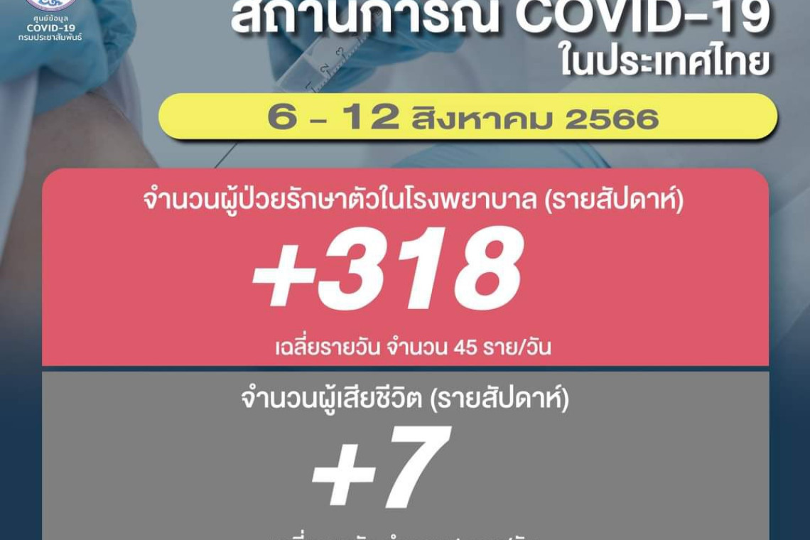 วันที่ 14 ส.ค.2566 ศูนย์ข้อมูล COVID-19 กรมประชาสัมพันธ์ รายงานสถานการณ์โรคโควิด-19 รายสัปดาห์ เกาะติดยอดผู้ติดเชื้อโควิด-19 รายสัปดาห์ ระหว่างวันที่ 6 สิงหาคม - 12 สิงหาคม 2566 พบผู้ป่วยรักษาตัวในโรงพยาบาล (รายสัปดาห์) จำนวน 318 ราย : เฉลี่ยรายวัน จำนวน 45 ราย/วัน ขยับเพิ่มขึ้นกว่ารอบสัปดาห์ที่ผ่านมาเล็กน้อย ในขณะที่พยผู้เสียชีวิต (รายสัปดาห์) จำนวน 7 ราย : เฉลี่ยรายวัน จำนวน 1 ราย/วัน ทั้งนี้พบยอดป่วยสะสม 31,843 ราย (ตั้งแต่ 1 มกราคม 2566)เสียชีวิตสะสม 775 ราย (ตั้งแต่ 1 มกราคม 2566)