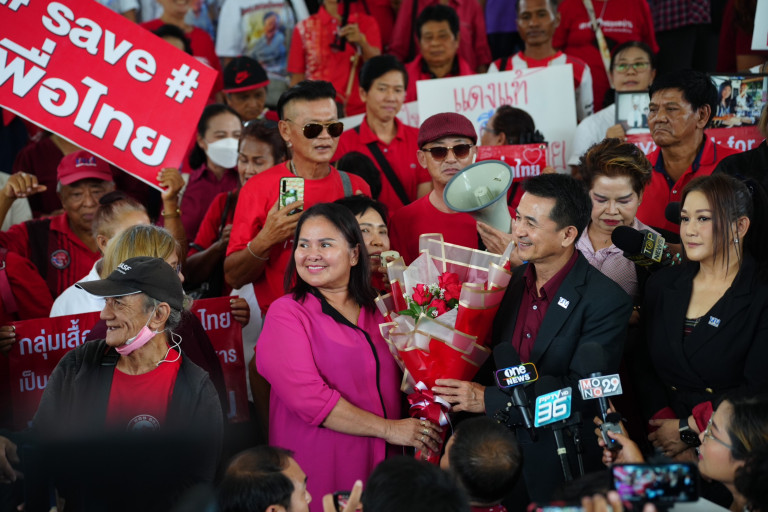 ขณะที่กลุ่มคนเสื้อแดง จังหวัดปทุมธานี มาให้กำลังใจพรรคเพื่อไทยในการจัดตั้งรัฐบาล โดยมีนายประเสริฐ จันทรรวงทอง เลขาธิการพรรคเพื่อไทยรับหนังสือจากมวลชน ก่อนที่ตัวแทนจะอ่านแถลงการณ์ฉบับดังกล่าว มีใจความว่า “ภาคประชาชน ซึ่งมีนาย ศรรัก มาลัยทอง (ทองชัย) พร้อมด้วย เสธเต่า สำภาทอง ข้าราชการบำนาญ และคณะพี่น้องประชาชนทุกสาขาอาชีพทุกสีทุกกลุ่ม รวมถึงนักต่อสู้เพื่อประชาธิปไตยที่เคยถูกดำเนินคดีติดคุกติดตารางคดีที่เกี่ยวข้องกับทางการเมืองร่วมกัน มาประกาสนับสนุน “พรรคเพื่อไทย” เป็นแกนนำการจัดตั้งรัฐบาลของประชาชนคนไทยทุกสีทุกกลุ่มทั่วทั้งประเทศ เร่งแก้ไขปัญหาเรื่องปากท้องและความเป็นอยู่ให้พี่น้องประชาชนได้อยู่ดีกินดี ประชาชนได้อยู่อย่างมีสุข ยุติหยุดความขัดแย้ง หยุดความคิดที่เป็นอคติคิดต่างต่อกัน ขอบพระคุณที่เสียสละถอยกันคนละก้าว หยุดรัฐประหาร หยุดม็อบทุกม็อบ หยุดการทะเลาะกันในสภา มาร่วมจับมือกันผ่าวิกฤติช่วยกันแก้ไขปัญหานำพาประเทศพ้นความขัดแย้ง ช่วยเหลือประชาชนให้อิ่มปาก อิ่มท้อง มีงานทำ มีเงินเข้ากระเป๋า เหมือนดั่งเก่าก่อนตอนพรรคไทยรักไทยบริหารประเทศ ซึ้งมีอดีตท่านทักษิณ ชินวัตร เป็นผู้นำประเทศ