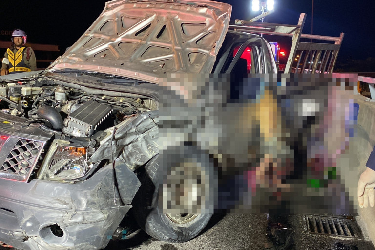 ที่เกิดเหตุเป็นถนน 3 เลน บริเวณเลนซ้ายสุดรถกระบะยี่ห้อนิสสัน สีบอนด์ หมายเลข 1 ฒฏ 389 กรุงเทพมหานครอยู่ในสภาพพังเสียหาย ล้อหลังฝั่งซ้ายแตก ฝากระโปรงเปิดขึ้น ผู้ขับขี่เป็นชายได้รับบาดเจ็บเล็กน้อย บาดเจ็บที่บริเวณศีรษะ และมีรอยพกช้ำตามแขนไม่ทราบชื่อ อายุประมาณ 50 - 55 ปี อาชีพช่างแอร์ กู้ภัยช่วยปฐมพยาบาลเบื้องต้น ส่วนฝั่งผู้โดยสารพบเสียชีวิตชาย 1 ราย สภาพศพร่างกายตั้งแต่ส่วนหัวไปจนถึงท้อง พาดออกมานอกรถแล้วกระแทกกับขอบสะพานอย่างรุนแรง ศรีษะเปิด แต่งกายใส่กางเกงขายาวสีน้ำเงิน เสื้อยืดคอกลม ทราบเป็นชาย อายุ 38 ปี อาชีพรับจ้าง และในจุดเกิดเหตุยังพบรถยนต์ยี่ห้อ ฟอร์จูนเนอร์ สีดำ อยู่บนรถยกของกู้ภัยทางด่วน บริเวณไฟหน้าฝั่งขวาแตก ไม่รับความเสียหาย