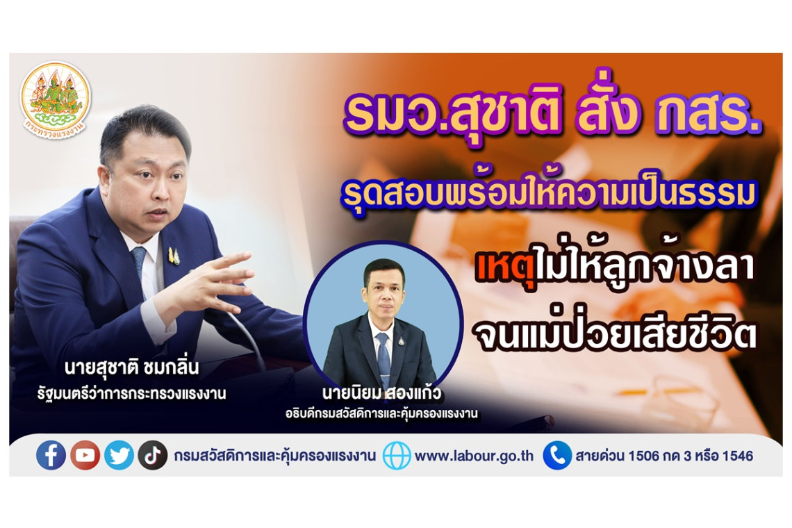 รมว.แรงงาน สั่ง กสร.ตรวจสอบข้อเท็จจริง กรณีลูกจ้างสาวขอลางานไปดูอาการแม่ป่วยหนัก แต่หัวหน้าไม่ให้ลาจนแม่เสียชีวิต พร้อมให้ความเป็นธรรมแก่ลูกจ้างและนายจ้าง