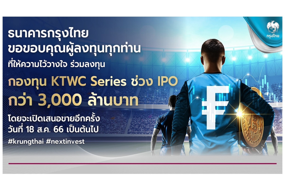 ธนาคารกรุงไทยปลื้มยอดจองซื้อกองทุน Krungthai World Class Series รวมกว่า 3,000 ล้านบาท สะท้อนความสำเร็จของความร่วมมือกับฟิเดลิตี้ ตอบโจทย์ผู้ลงทุนไทย เตรียมเสนอขายรอบ 2 ตั้งแต่ 18 ส.ค.นี้