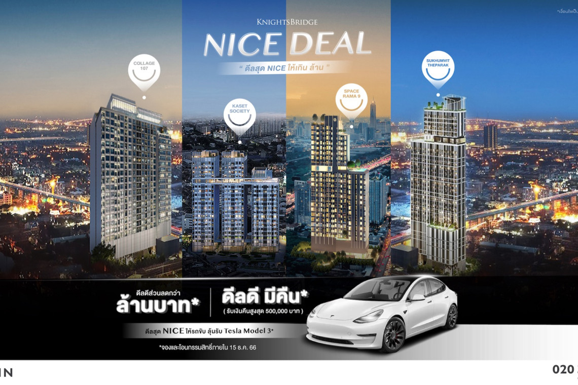 พาร์ค ลักชัวรี่ ผู้พัฒนาอสังหาริมทรัพย์ระดับลักชัวรี่ ในเครือ บริษัท ออริจิ้น พร็อพเพอร์ตี้ จำกัด (มหาชน) จัดแคมเปญ KnightsBridge Nice Deal ดีลสุด Nice ให้เกินล้าน ขนทัพ 4 คอนโดแบรนด์ KnightsBridge (ไนท์บริดจ์) พร้อมอยู่ ติดรถไฟฟ้า ราคาเริ่ม 3.59.ลบ.* เอาใจคนชอบปิดดีล กับโอกาสพิเศษดีลปิดตึก ดีลที่ 1 ดีลดีลดเป็นล้าน* พบกับห้องราคาพิเศษ พร้อมอยู่ดีลที่ 2 ดีลดีมีคืน (รับเงินคืนสูงสุด 500,000 บาท)* ดีลที่ 3 ดีลสุด Nice ให้รถขับ (ลุ้นรับ Tesla Model 3)* ไขคอนโดสตาร์ท Tesla Model 3 มูลค่ากว่า 1.79 ล้านบาท ปิดดีลภายในวันที่ 15 ธันวาคม 2566 โดยจองได้ตั้งแต่วันนี้เป็นไป *เงื่อนไขเป็นไปตามที่บริษัทกำหนด (สงวนสิทธิ์ลุ้นรางวัลเฉพาะลูกค้าที่จองและโอนกรรมสิทธิ์)