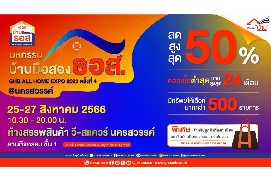 ธอส.จัดงานมหกรรมบ้านมือสอง ธอส. GHB ALL HOME EXPO 2023 ครั้งที่ 4 @นครสวรรค์ นำทรัพย์เด่น ทำเลดี ราคาคุ้มค่ากว่า 500 รายการ มาจำหน่ายพร้อมส่วนลดสูงสุด 50%