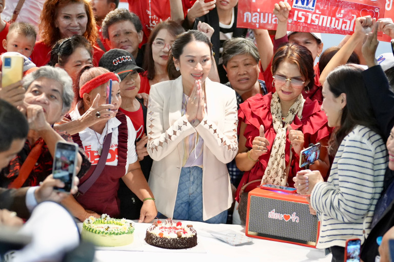 ต่อมานางสาวแพทองธาร ได้ตัดเค้กที่กลุ่มคนเสื้อแดงนำมาให้ และถ่ายภาพร่วมกัน ก่อนจะขึ้นไปด้านบนของที่ทำการพรรค เพื่อเข้าร่วมประชุม สส. ของพรรคเพื่อไทย
