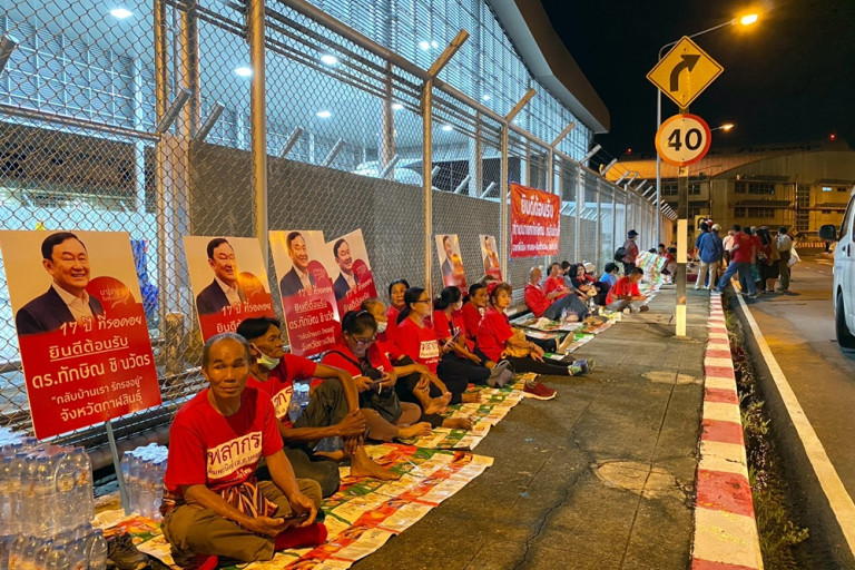 เมื่อเวลา 04.30 น. วันที่ 21 ส.ค.66 ที่บริเวณปากทางถนนเทวฤทธิ์พันลึก ซึ่งอยู่ริมถนนวิภาวดีรังสิต อีกจุดซึ่งไม่ไกลจากทางเข้า M-JET มีมวลชนเสื้อแดง FC นายทักษิณ ชินวัตร อดีตนายกรัฐมนตรี ที่จะบินกลับประไทยด้วยเครื่องบินส่วนตัวจะถึงที่สนามบินดอนเมือง ในเวลา 09.00 น. โดยมีมวลชนเสื้อแดง และ FC มารอต้อนรับกันจำนวนมาก ประเมินด้วยสายตาประมาณ 300-350 คนต่างคนสวมใส่แต่งกายชุดสีแดง บางกลุ่มได้มาปักหลักกลางเต้นนอนกันตั้งแต่เมื่อคืนถึงฝนจะตกลงมากลุ่มมวลชนก็ยังไม่ไปไหนบริเวณรอบๆยังมีป้ายที่เขียนต้อนรับ นายทักษิณ ชินวัตร อดีตนายกรัฐมนตรี ติดอยู่ เช่นเขียนคำว่า