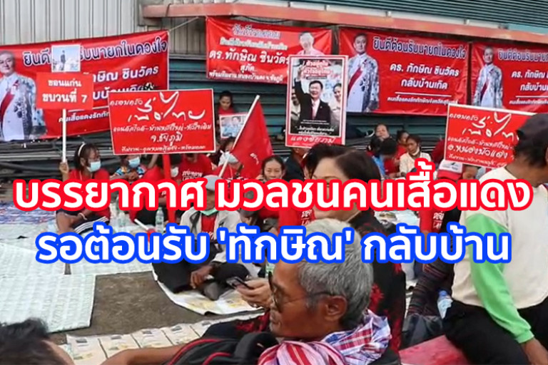 บรรยากาศ ด้านข้างอาคารคลังสินค้า 4 ของท่าอากาศยานดอนเมือง พบว่ามีกลุ่มมวลชนคนเสื้อแดง จำนวนกว่า 300 คน ที่เดินทางมาพร้อมนำป้ายไวนิลรูปภาพอดีตนายกฯทักษิณเพื่อรอต้อนรับ โดยมวลชนนั่งปักหลักรอตั้งแต่หัวถนนลึกเข้าไปถึงด้านใน ยาวประมาณ 200 เมตร ซึ่งใกล้กับอาคารที่อดีตนายกฯ จะมาลงเครื่องซึ่งจะผ่านมวลชนที่อยู่บริเวณนี้ โดยมีเจ้าหน้าที่ตำรวจหลายหน่วยงาน รวมถึง สน.ดอนเมืองคอยอำนวยความสะดวก