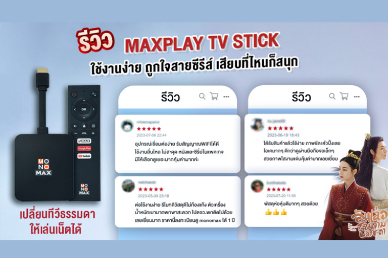 “MONOMAX” (โมโนแมกซ์) สุดยอดหนังดี ซีรีส์ดังพากย์ไทยครบทุกเรื่อง เอาใจคอหนังและซีรีส์แบบจัดเต็มทุกความบันเทิง ด้วยอุปกรณ์ “MAXPLAY TV STICK” กล่องแอนดรอยด์ทีวีขนาดพกพา อุปกรณ์ที่จะช่วยให้การดูหนัง ดูซีรีส์ของคุณ สะดวกสบาย และสนุกสนานเต็มอรรถรสกว่าเคย โดยเป็นอุปกรณ์ที่จะเปลี่ยนทีวีเครื่องเก่าให้กลายเป็นแอนดรอยด์ทีวี (Android TV) เรียกได้ว่าสามารถรับชมความบันเทิงได้ทุกอย่างครบจบบนทีวีของคุณ การันตีคุณภาพ!!! จากรีวิวจากผู้ใช้งานจริง พิเศษ!!! เมื่อซื้อ MAXPLAY TV STICK สามารถดู MONOMAX ได้นาน 1 ปี ในราคาเพียง 2,199 บาท สามารถรับชมได้พร้อมกัน 2 อุปกรณ์ สนใจสั่งซื้อได้ทาง TikTok Shop , Shopee , Lazada และ LINE SHOPPING