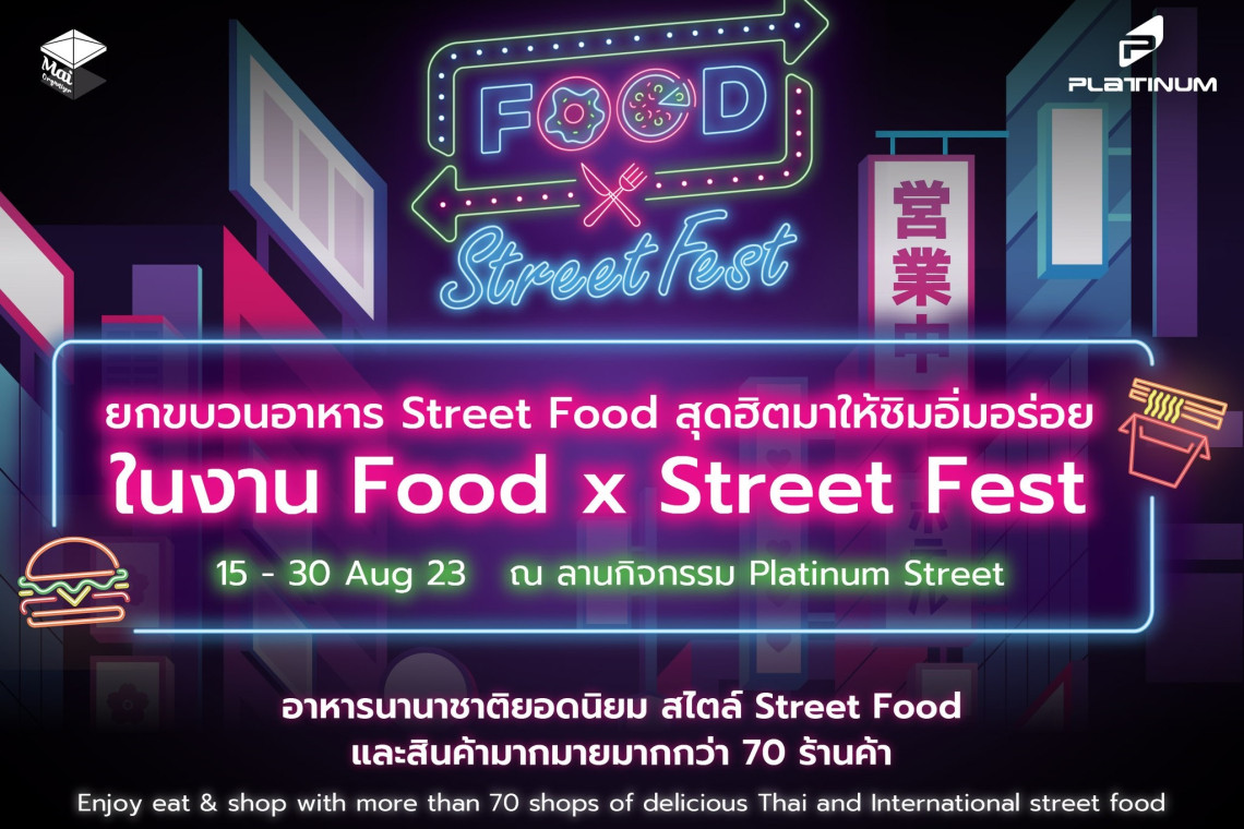 ศูนย์การค้าแพลทินัม เชิญชวนช้อป ชิล ชิม ในงาน Food x Street Fest ยกทัพอาหารคาวหวานเอาใจสายสตรีท ฟู้ด เลิฟเวอร์ อร่อยเน้นๆ กับหลากเมนูน่าทาน อาทิ ขนมจีบไก่, ขนมจีบกุ้ง, ซาลาเปาเผือก, ซาลาเปาไส้ครีม, ปอเปี๊ยะผัก, ถุงเงินไก่, เกี๊ยวซ่าไก่ ,บาร์บีคิว, ผัดไทย, ก๋วยเตี๋ยว,ผลไม้,ขนมหวาน ตลอดจนเครื่องดื่มอีกมากมาย นอกจากนี้ยังมีสินค้าเสื้อผ้าแฟชั่นเครื่องประดับ รวมมากกว่า 70 ร้านค้า พร้อมตื่นตาตื่นใจไปกับ การแสดง มายากล ภายในงาน ตั้งแต่วันนี้ – 30 สิงหาคม 66 ณ ลานกิจกรรมแพลทินัม สตรีท ติดตามรายละเอียดร้านค้าและโปรโมชั่นที่น่าสนใจ ได้ที่ FB: Platinum Fashion Mall แพลทินัม แฟชั่น มอลล์