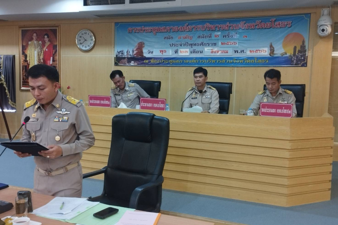 วันที่ 23 ส.ค. 66. เวลา .10.00 น.ที่ห้องประชุมสภาองค์การบริหารส่วนจังหวัดยโสธร นายอนุพงศ์ นาคสุข ประธานสภา อบจ.ยโสธรได้เปิดประชุมสภาสมัยสามัญ สมัยที่ 2 ครั้งที่ 3 ประจำปี พ.ศ. 2566 เพื่อให้สมาชิกสภาองค์การบริหารส่วนจังหวัดยโสธรได้พิจารณาร่างข้อบัญญัติงบประมาณรายจ่ายประจำปี 2567 ตามที่ทางคณะผู้บริหาร อบจ.ยโสธรโดยนายวิเชียร สมวงศ์ นายกองค์การบริหารส่วนจังหวัดยโสธรได้นำร่างข้อบัญญัติงบประมาณราบจ่ายปี 2567นำเสนอต่อสภาองค์การบริหารส่วนจังหวัดยโสธรเพื่อให้สมาชิกภา อบจ.พิจารณาให้ความเห็นชอบโดยมีจำนวนเงินของร่างข้อบัญญัติงบประมาณรายจ่ายประจำปี 2567 จำนวน 391,127,500.00 บาท โดยนายวิเชียร สมวงศ์ ได้อธิบายถึงหลักการและเหตุผลของการนำร่างข้อบัญญัติงบประมาณปี 2567 สมาชิกสภา อบจ.ได้รับแล้วเมื่อครั้งการประชุมที่ผ่านมาและตั้งคณะกรรมการแปรญัตติพร้อมทั้งได้ทำการแปรญัตติเรียบร้อยแล้วจึงนำเข้าประชุมสภาอบจ.อีกครั้งในวันนี้ซึ่งสมาชิกสภา อบจ.ก็ยกมือให้ความเห็นชอบร่างดังกล่าวให้เป็นข้อบัญญัติงบประมาณรายจ่ายประจำปี 2567 ด้วยจำนวนเงิน 391.1ล้านบาท โดยมีรองนายก อบจ.ที่ปรึกษานายก อบจ.ส.อบจ ตลอดจนหัวหน้ากองและเจ้าหน้าที่องค์การบริหารส่วนจังหวัดยโสธรร่วมประชุมในครั้งนี้