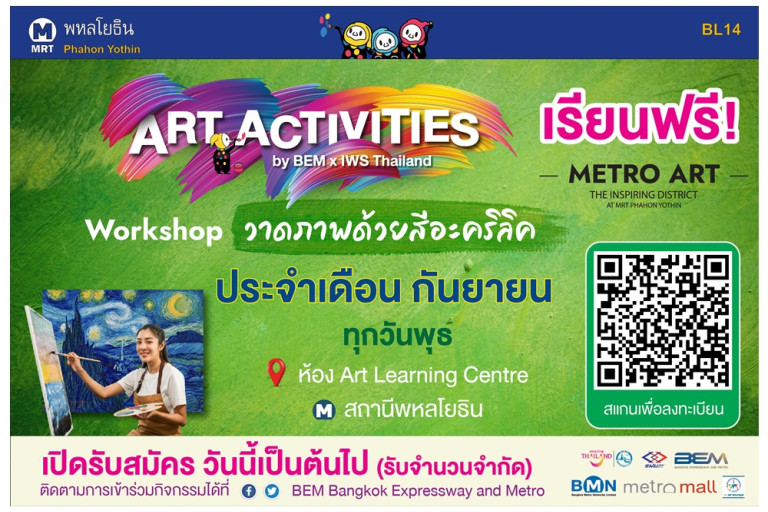 เดือนกันยายนนี้ ยกระดับอีกขั้นของการสร้างสรรค์ผลงานศิลป์ด้วยสีอะคริลิก กิจกรรมที่จะพาทุกคนเปิดประตูสู่โลกจินตนาการในสถานีศิลปะ พบกับ “Art Activities” จาก “Metro Art สถานีพหลโยธิน” ที่จัดโดย บริษัท ทางด่วนและรถไฟฟ้ากรุงเทพ จำกัด (มหาชน) หรือ BEM ผู้ให้บริการทางพิเศษและรถไฟฟ้า MRT สายสีน้ำเงินและสายสีม่วง ร่วมกับเครือข่ายสมาคมสีน้ำโลก IWS ประเทศไทย (International Watercolor Society)