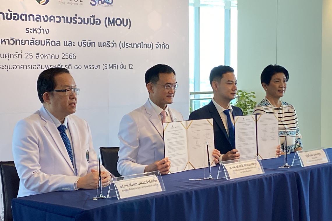วันที่ 25 สิงหาคม 2566 ที่โถงจัดแสดงและห้องประชุมอาคารเฉลิมพระเกียรติ ๘๐ พรรษา ศูนย์วิจัยการแพทย์ศิริราช(SiMR) ชั้น 12 คณะแพทยศาสตร์ศิริราชโรงพยาบาล มหาวิทยาลัยมหิดล และบริษัท แคริว่า (ประเทศไทย) จำกัดร่วมลงนามบันทึกข้อตกลงความร่วมมือ (MOU) โดยมี ศ.นพ.อภิชาติ อัศวมงคลกุล คณบดีคณะแพทยศาสตร์ศิริราชพยาบาล มหาวิทยาลัยมหิดล รศ.นพ.เชิดชัย นพมณีจำรัสเลิศ รองคณบดีฝ่ายนวัตกรรมบริการและคุณค่าองค์กร คณะแพทย์ศิริราชพยาบาล มหาวิทยาลัยมหิดล นายศิวดล มาตยากูร ผู้ร่วมก่อตั้ง บริษัท แคริว่า (CARIVA) ประเทศไทยจำกัด นางนาถฤดี โฆสิตาภัย รองกรรมการผู้จัดการใหญ่ กลุ่มงานเทคโนโลยีและคาร์บอนโซลูชั่น บริษัทปตท.สำรวจและผลิตปิโตรเลียม จำกัด (มหาชน) เข้าร่วม