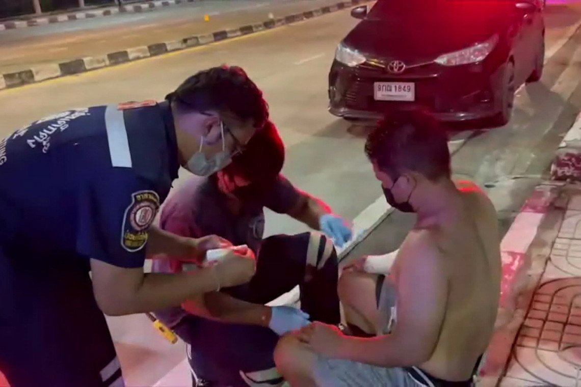 ในที่เกิดเหตุเป็นสวนสาธารณะ พบ MR. KYAW MIN SWE อายุ 37 ปี ชาวเมียนมา นั่งอยู่ริมฟุตบาท มีบาดแผลถูกกัดที่ข้อมือและแขน ข้างซ้าย จนเป็นแผลเหวอะหวะ เจ้าหน้าที่มูลนิธิให้การช่วยเหลือปฐมพยาบาลเบื้องต้นก่อนนำส่งโรงพยาบาลบางบ่อ