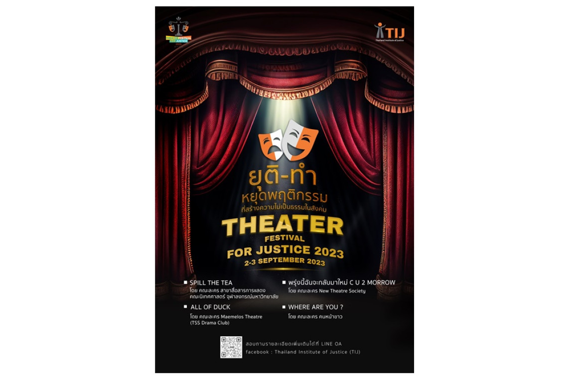 สถาบันเพื่อการยุติธรรมแห่งประเทศไทย หรือ Thailand Institute of Justice (TIJ) จัดเทศกาลละคร เพื่อความยุติธรรม - Theater Festival for Justice 2023 ภายใต้แนวคิด “ยุติ-ทำ” หยุดพฤติกรรมที่สร้างความไม่เป็นธรรมในสังคม ขึ้น เป็นครั้งแรก ถ่ายทอดผ่านคณะละครเวที 4 เรื่อง 4 สไตล์ ในวันเสาร์ที่ 2 และ วันอาทิตย์ 3 กันยายน 2566 เวลา 13.00 น. เป็นต้นไป ณ TIJ Common Ground อาคารสำนักงานสถาบันเพื่อการยุติธรรมแห่งประเทศไทย ถนนแจ้งวัฒนะ กระทรวงยุติธรรม ดังนี้