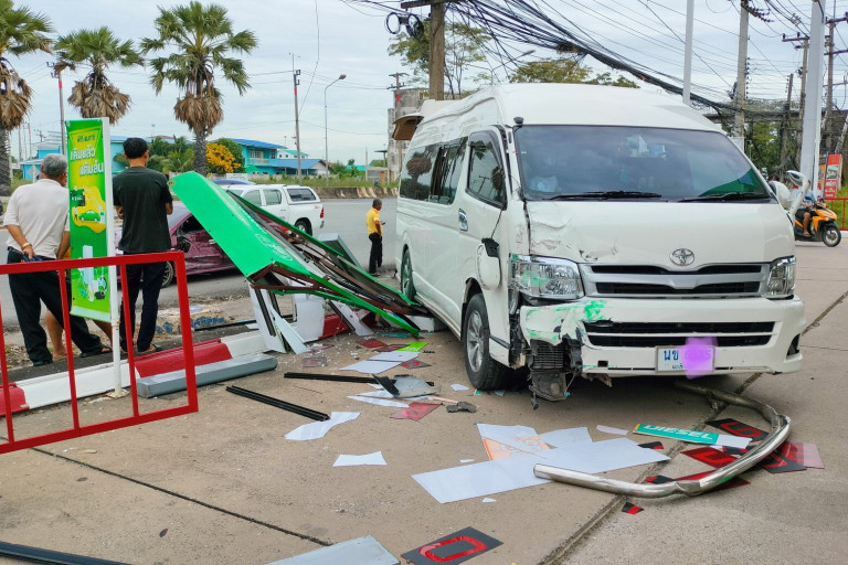 หวิดเทกระจาดหมู่รับอรุณ รถตู้รับส่งนักเรียนพุ่งชนรถยนต์เก๋ง ขณะกำลังออกมาจากจุดยูเทิร์นกลับรถตัดหน้าทำเสียหลักเสยป้ายบอกราคาปั้มน้ำมัน โชคดีที่ไม่มีใครได้รับบาดเจ็บหรือเสียชีวิต ขณะทั้ง 2 ฝ่ายมีการทำประกันภัยภาคสมัครใจไว้ ด้านคนขับเก๋งยอมรับสภาพเป็นฝ่ายผิด