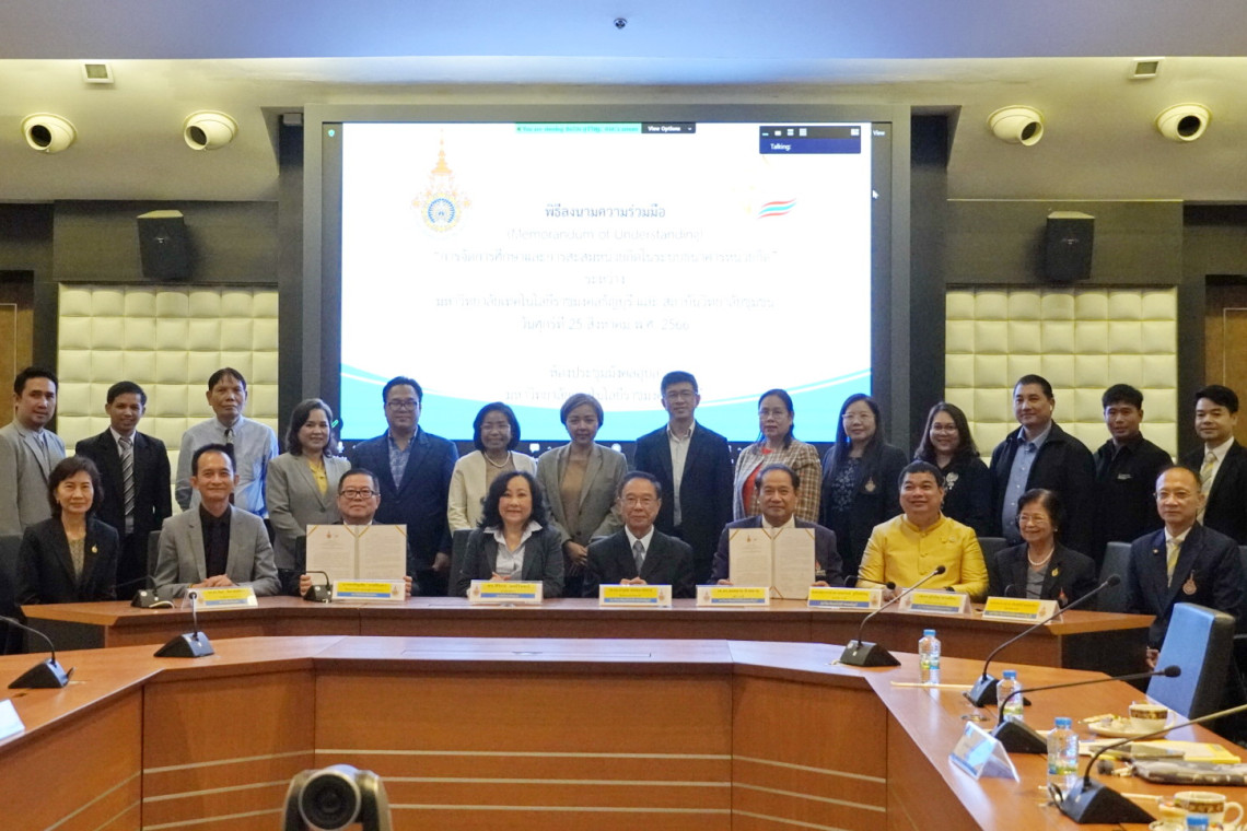 เมื่อเร็ว ๆนี้ รศ.ดร.สมหมาย ผิวสอาด อธิการบดี มทร.ธัญบุรี และนายเจริญชัย วงษ์จินดา รักษาราชการแทนผู้อำนวยการสถาบันวิทยาลัยชุมชน (ส.วชช.) ร่วมลงนามความร่วมมือ “การจัดการศึกษาและการสะสมหน่วยกิตในระบบธนาคารหน่วยกิต โดยมี ดร.สิริกร มณีรินทร์ นายกสภาสถาบันวิทยาลัยชุมชน และรศ.ดร.นำยุทธ สงค์ธนาพิทักษ์ ที่ปรึกษามทร.ธัญบุรี ให้เกียรติร่วมเป็นสักขีพยาน ที่ ห้องประชุมมังคลอุบล มหาวิทยาลัยเทคโนโลยีราชมงคล (มทร.) ธัญบุรี
