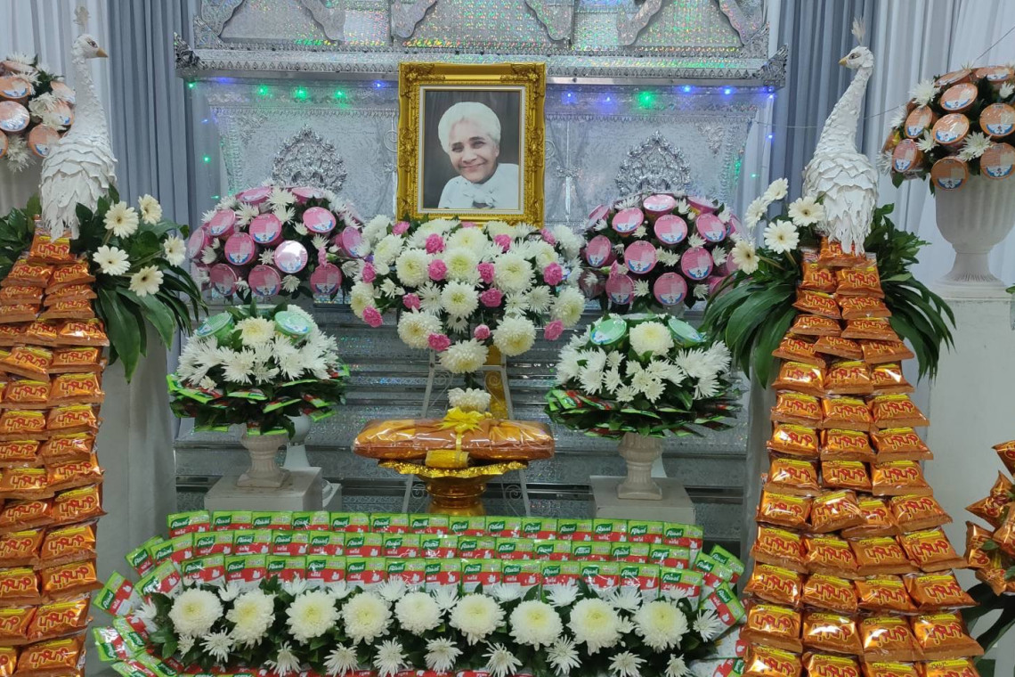 นางสาวเนตรดาว สู้ณรงค์ ครอบครัวผู้เสียชีวิต บอกว่า ลูกหลานของผู้เสียชีวิตต้องการจะจัดงานเพื่อเป็นบุญกุศลให้กับผู้วายชนให้มากที่สุด โดยสิ่งของที่นำมาตกแต่งประดับประดาที่สวยงามหน้าหีบศพ ต้องการจะนำสิ่งของเหล่านี้ทำบุญให้ผ่านไปยังมูลนิธิเพื่อนำไปช่วยเหลือชาวบ้านที่ยากไร้จริงๆ อีกทั้งทางวัดก็อยากให้มีการส่งเสริมรณรงค์ใช้สิ่งของที่เป็นประโยชน์ให้มากที่สุดด้วยเพื่อไม่ให้เหลือสร้างขยะให้กับวัด และการจัดช่อดอกไม้และนกยูงในครั้งนี้ เสียค่าใช้จ่ายเพียง 13,500 บาท จากปกติหากตกแต่งแบบนี้จะต้องเสียค่าดอกไม้สดสูงถึง 30,000 บาท