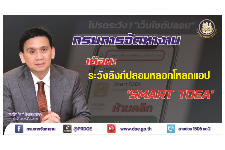 นายไพโรจน์ โชติกเสถียร อธิบดีกรมการจัดหางาน เปิดเผยว่า ปัจจุบันมิจฉาชีพมีวิธีหลอกลวงผู้ใช้งานผ่านโซเชียลมีเดียในรูปแบบที่หลากหลายและซับซ้อนขึ้น ล่าสุดพบการแจ้งลิงก์ปลอมหลอกลวงให้ดาวน์โหลดแอปพลิเคชัน ที่มีหน้าตาคล้ายแอปพลิเคชัน ‘Smart TOEA’ ของกรมการจัดหางาน จึงขอเตือนประชาชนที่ต้องการใช้งานแอปพลิเคชัน ‘Smart TOEA’ ห้ามดาวน์โหลดผ่านลิงก์โดยเด็ดขาด เพื่อความปลอดภัย หากต้องการดาวน์โหลดแอปพลิเคชัน สามารถดาวน์โหลดได้ที่ App Store สำหรับระบบ iOS และ Play Store สำหรับระบบ Android หรือหากพบพฤติการณ์ดังกล่าวให้ติดต่อสอบถามกับกรมการจัดหางานโดยตรงที่สายด่วน 1506 กด 2