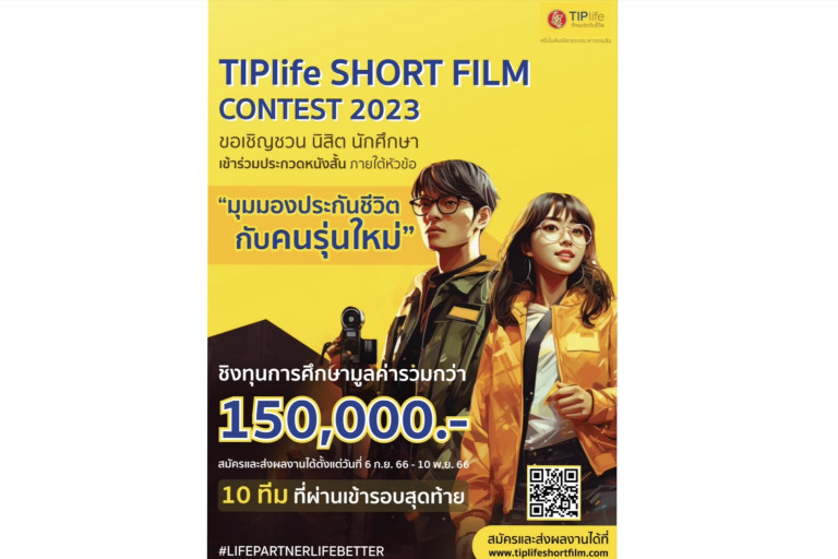 TIPlife ทิพยประกันชีวิต ขอเชิญชวน นิสิต นักศึกษาจากทั่วประเทศ ร่วมส่งผลงานหนังสั้นเข้าประกวดในหัวข้อ "มุมมองประกันชีวิตกับคนรุ่นใหม่" ชิงเงินรางวัลมูลค่ารวมกว่า 150,000 บาท