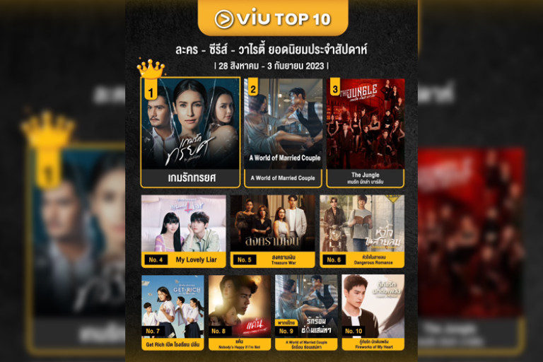 ปล่อยหมัดเด็ดทุกวินาทีจริงๆ สำหรับแอปพลิเคชั่น Viu นอกจากจะส่งคอนเทนต์ชุดใหญ่ซีรีส์โดนใจแบบจุใจไม่ให้ผู้ชมได้พักแล้ว ล่าสุดได้คว้าเอาซีรีส์ที่ทั้งแรงสุดและแซ่บสุดในสามโลก “เกมรักทรยศ” มาเสิร์ฟแฟนๆจนหน้าจอ แอปพลิเคชัน Viu (วิว) สะเทือนกับกระแสที่มีผู้เข้ามาชมแบบถล่มทลาย โดนใจ #ทีมเมียหลวง ไปแบบเต็มๆสมกับที่แฟนซีรีส์ ต่างตั้งตารอคอย ทุกเสียงยกมือขอส่งแรงใจแรงเชียร์ “แอน ทองประสม” ในบทหมอเจน จิตแพทย์หญิงที่ต้องพบกับความจริงทุกช็อก เมื่อสามีที่เธอรักและไว้ใจ ซ่อนเมียน้อยเอาไว้ และช็อกยิ่งกว่าเมื่อพบว่า ทุกคนรอบตัวเธอ กลับรู้ความจริงอันน่ารังเกียจนี้ และต่างปิดบังเธอเอาไว้ ทันทีที่ออกฉายก็กลายเป็นกระแสทะลักโซเชียลกันไปเลย เพราะไม่ว่าใครก็ได้ดูก็ต้องอินกับดราม่าอันเข้มข้นของชีวิตหมอเจนที่ฮิตจนกระทั่งพุ่งขึ้นสู่อันดับ 1 ไปเป็นที่เรียบร้อย พร้อมยังจูงมือ “A World of Married Couple” ซีรีส์ฉบับเกาหลี ที่ดัดแปลงจากซีรีส์ต้นฉบับสัญชาติอังกฤษเรื่องเดียวกันอย่าง Doctor Foster กลับมาได้รับความนิยมจนยอดวิวพุ่งอีกครั้ง ขึ้นมาอยู่เคียงข้างกันในอันดับที่ 2 ใน Ranking Viu (วิว) แอปพลิเคชันอันดับ 1 ตอบโจทย์ครอบจักรวาลอย่างสวยงาม