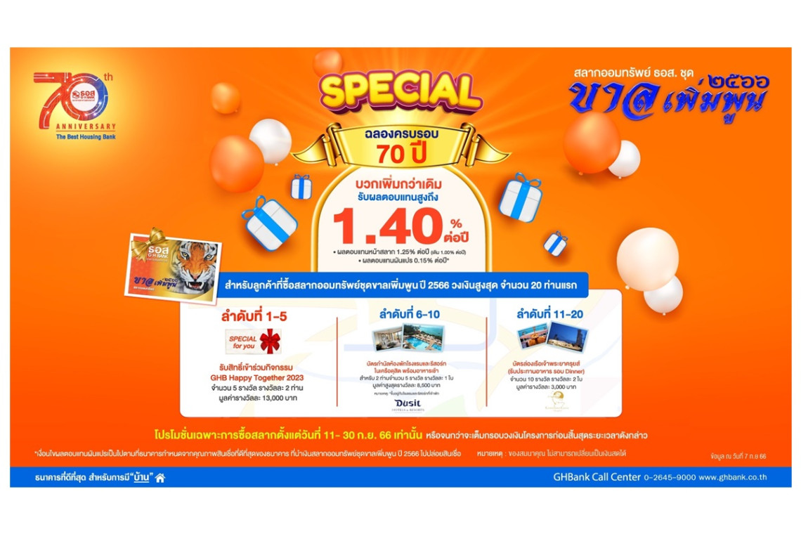 ธนาคารอาคารสงเคราะห์ (ธอส.) ฉลองครบรอบ 70 ปี จัดโปรโมชันเอาใจคนรักการออม เพียงซื้อ “สลากออมทรัพย์ ชุดขาลเพิ่มพูน ปี 2566” ตั้งแต่วันที่ 11-30 กันยายน 2566 หรือจนกว่าจะเต็มกรอบวงเงินโครงการก่อนสิ้นสุดระยะเวลาดังกล่าว ผ่านช่องทาง Mobile Application : GHB ALL GEN และ ธอส. ทุกสาขาทั่วประเทศ จำหน่ายหน่วยละ 1,000 บาท ฝากครบ 3 ปี รับผลตอบแทนหน้าสลากเพิ่มขึ้นอีก 0.25% ต่อปี หรือ สูงถึง 1.40% ต่อปี (เงื่อนไขรับผลตอบแทนเป็นไปตามที่ธนาคารกำหนด) พร้อมกันนี้ ยังมีโอกาสลุ้นรางวัลที่ 1 มูลค่ารางวัลสูงถึง 2 ล้านบาททุกเดือนรวม 36 ครั้ง หากซื้อสลากตั้งแต่ 100,000 บาทขึ้นไป การันตีถูกรางวัลเลขท้าย 2 ตัวทุกงวด คิดเป็นผลตอบแทนขั้นต่ำสูงถึง 1.880% ต่อปี และหากซื้อสลากตั้งแต่ 1 ล้านบาทขึ้นไป การันตีถูกรางวัลเลขท้าย 2 ตัว และ 3 ตัวทุกงวด คิดเป็นผลตอบแทนขั้นต่ำสูงถึง 1.988% ต่อปี (ดอกเบี้ยและเงินรางวัลได้รับการยกเว้นภาษีเงินได้บุคคลธรรมดา)