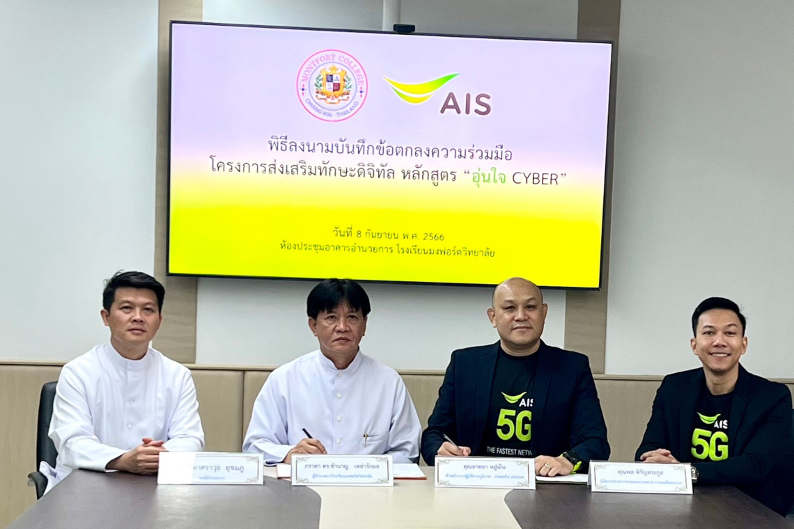 8 กันยายน 2566 : AIS จับมือโรงเรียนมงฟอร์ตวิทยาลัย จ.เชียงใหม่ ลงนามบันทึกข้อตกลงความร่วมมือ ขยายผลการเรียนรู้ทักษะดิจิทัล “หลักสูตรอุ่นใจไซเบอร์ ยกระดับการศึกษายุคดิจิทัลในการสร้างภูมิคุ้มกันภัยไซเบอร์ ส่งต่อความรู้ให้แก่ครู บุคลากรทางการศึกษาและนักเรียน ตั้งเป้าสร้างพลเมืองดิจิทัลพร้อมยกระดับดัชนีสุขภาวะดิจิทัล (Thailand Cyber Wellness Index) ให้อยู่ในระดับที่รู้เท่าทัน มีทักษะดิจิทัล สามารถใช้งานสื่อโซเชียลและเทคโนโลยีได้อย่างถูกต้อง ปลอดภัย และเหมาะสม ผ่านการนำหลักสูตรอุ่นใจไซเบอร์เข้าไปเป็นส่วนหนึ่งของสื่อการเรียนการสอน โดยเริ่มตั้งแต่ภาคการศึกษา 2566 เป็นต้นไป