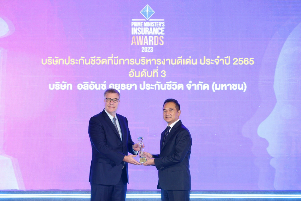 อลิอันซ์ อยุธยา ประกันชีวิต โดย มร. โทมัส วิลสัน ประธานเจ้าหน้าที่บริหารและกรรมการผู้จัดการใหญ่ รับรางวัลบริษัทประกันชีวิตที่มีการบริหารงานดีเด่น อันดับที่ 3 ประจำปี 2565 จาก นายกฤษฎา จีนะวิจารณา รัฐมนตรีช่วยว่าการกระทรวงการคลัง ประธานในพิธีมอบรางวัลประกันภัยดีเด่นครบวงจร Prime Minister’s Insurance Awards ประจำปี 2566 จัดขึ้นโดย สำนักงานคณะกรรมการกำกับและส่งเสริมการประกอบธุรกิจประกันภัย (คปภ.) เพื่อส่งเสริมบทบาทของอุตสาหกรรมประกันภัยให้เป็นที่เชื่อถือศรัทธาและเป็นที่ยอมรับของประชาชน รางวัลนี้ถือเป็นที่พิสูจน์ความมุ่งมั่นของอลิอันซ์ อยุธยา ในการพัฒนาบริการผลิตภัณฑ์และบริการประกันภัยอย่างต่อเนื่อง เพื่อให้ลูกค้าได้รับประสบการณ์ด้านประกันภัยที่ดีที่สุด ณ ห้องประชุม ฟีนิกซ์ 1-6 ศูนย์แสดงสินค้าและการประชุมอิมแพ็ค เมืองทองธานี เมื่อเร็ว ๆ นี้