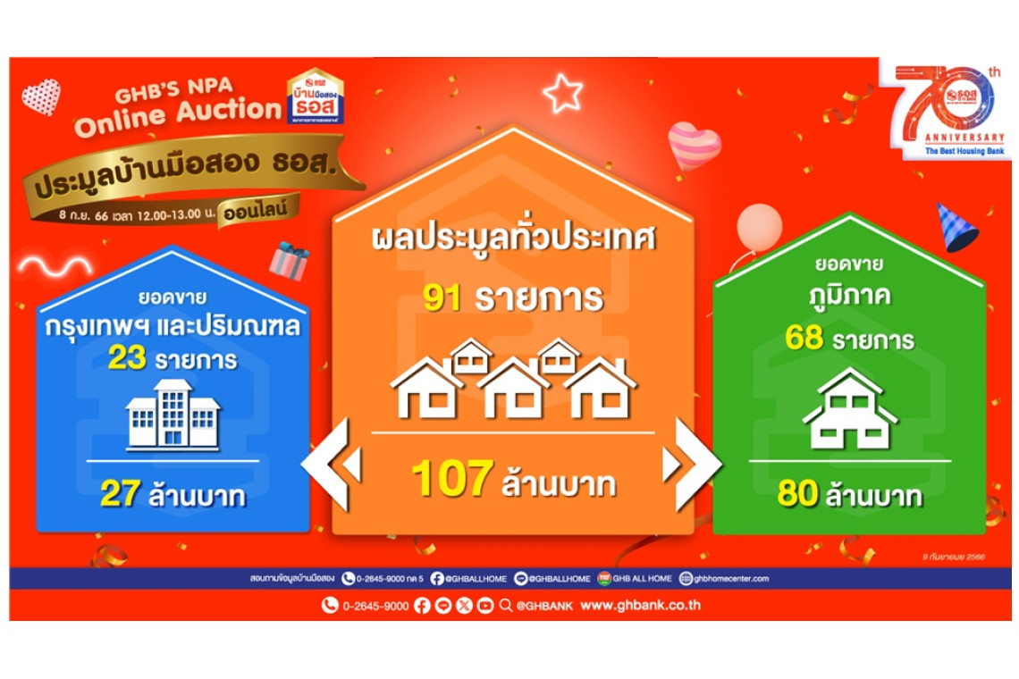 ธอส. เผยผลการจัดงานประมูลขายบ้านมือสองออนไลน์ เพียง 1 ชั่วโมงเดียว จำหน่ายได้แล้ว 91 รายการ มูลค่ารวมกว่า 107 ล้านบาท