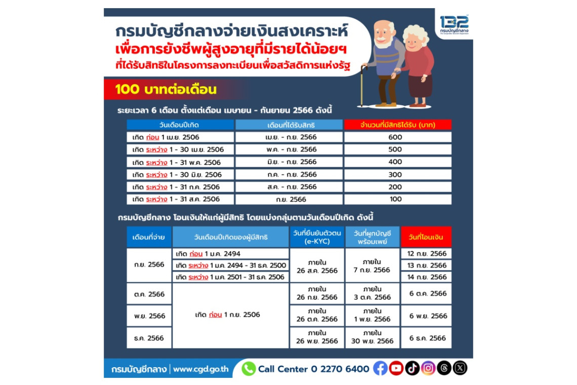 กรมบัญชีกลางจ่ายเงินสงเคราะห์เพื่อการยังชีพแก่ผู้สูงอายุที่มีรายได้น้อยที่ได้รับสิทธิในโครงการลงทะเบียนเพื่อสวัสดิการแห่งรัฐปี 2565 ในปีงบประมาณ พ.ศ.2566 ในอัตรา 100 บาทต่อเดือน เป็นระยะเวลา 6 เดือน ตั้งแต่เดือนเม.ย.-ก.ย.66 รับสุงสุด 6 เดือน 600 บาท โอนเงินงวดแรก 12 ก.ย.นี้