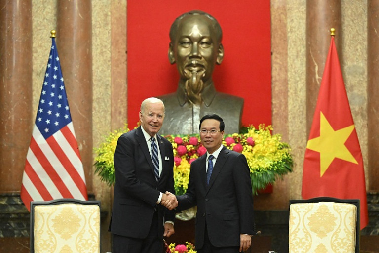 รายงานข่าวแจ้งว่า ประธานาธิบดีไบเดน ได้หารือกับคณะผู้นำของเวียดนาม ในเรื่องของการเดินหน้ายกระดับความสัมพันธ์ระหว่างกันเกี่ยวกับความเป็นหุ้นส่วนยุทธศาสตร์รอบด้าน ซึ่งเป็นแผนงานที่ทำเนียบขาวสหรัฐฯ ระบุว่า เป็นสิ่งที่ไม่เคยมีมาก่อน และมีความสำคัญยิ่ง อันจะส่งผลผลักดันให้สหรัฐฯ ได้ก้าวขึ้นมาอยู่ในจุดเดียวกันกับจีน ที่มีความสัมพันธ์ทางการทูตกับเวียดนามในระดับสูงมาก