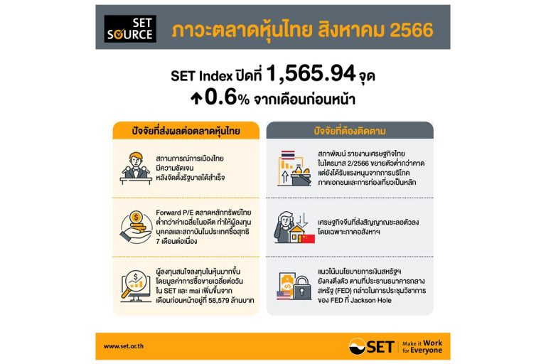 ทั้งนี้่หากพิจารณาจากอัตราส่วน Forward PE ของ SET Index ค่อนข้างต่ำกว่าค่าเฉลี่ยในอดีต ทำให้ผู้ลงทุนบุคคลและสถาบันในประเทศซื้อสุทธิ 7 เดือนต่อเนื่อง ณ สิ้นเดือนส.ค. 2566 SET Index ปิดที่ 1,565.94 จุด ปรับเพิ่มขึ้น 0.6% จากเดือนก่อนหน้าซึ่งเป็นไปในทิศทางตรงกันข้ามกับดัชนีหลักทรัพย์อื่นๆ ในภูมิภาค และปรับลดลง 6.2% เมื่อเทียบกับสิ้นปีก่อนหน้า กลุ่มอุตสาหกรรมที่ปรับตัวดีกว่า SET Index เมื่อเทียบกับสิ้นปี 2565 ได้แก่ กลุ่มเทคโนโลยี กลุ่มการเงิน กลุ่มสินค้าอุปโภคบริโภค และกลุ่มบริการ
