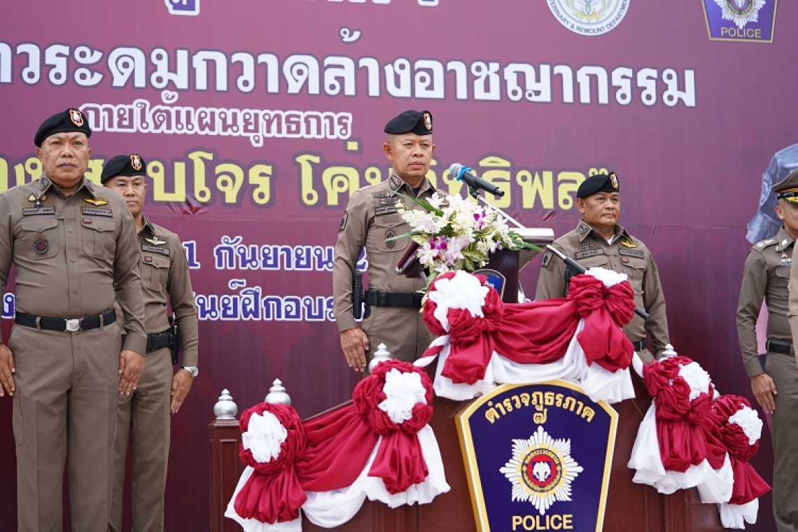 วันนี้ 11 กันยายน 66 วันจันทร์ที่ 11 กันยายน 2566 เวลา 17. 00 น.ลานฝึก กองบัญชาการตำรวจภูธรภาค 7 อ.เมือง จ.นครปฐม พล.ต.ท.ธนายุตม์ วุฒิจรัสธำรงค์ ผบช.ภ.7 เป็นประธานพิธีปล่อยแถวระดมกวาดล้างอาชญากรรม ภายใต้แผนยุทธการ “ ปิดเมือง สยบโจร โค่นอิทธิพล “ ทั้ง 8 จังหวัด 104 สถานีของตำรวจภูธรภาค 7 โดยมี พล.ต.ท.บุญญฤทธิ์ รอดมา ผทค.พิเศษ ตร.รรท.รอง ผบช.ภ.7 พล.ต.ท.วรายุทธ สุขวัฒน์ ผทค.พิเศษ ตร.รรท.รอง ผบช.ภ.7 พล.ต.ต.สิทธิชัย โล่กันภัย รอง ผบช.ภ.7 พล.ต.ต.อาทิชา เปาอินทร์ รอง ผบช.ภ.7พล.ต.ต.วัฒนา ยี่จีน รอง ผบช.ภ.7 พล.ต.ต.อุทัย กวินเดชาธร รอง ผบช.ภ.7 พล.ต.ต.ชมชวิณ ปุระธนานนท์ รอง ผบช.ภ.พร้อมด้วยผู้บังการการตำรวจภูธรจังหวัดทั้ง 8 จังหวัดและผู้กำกับการในพื้นที่จังหวัดนครปฐม ฝ่ายปกครอง , กอ.รมน.จังหวัดนครปฐม ในการระดมกำลังครั้งใหญ่หลังเกิดเหตุ คดียิง พ.ต.ต.ศิวกร สายบัว สว.ทล.1 กก.2 บก.ทล. สารวัตร ภายในบ้านของกำนันนก และมีการวิสามัญ หน่อง มือปืน ก่อนที่ล่าสุดวันนี้ พ.ต.อ.วชิรา ยาวไทยสงค์ ผกก.ทล.1 กก.2 (ผู้กำกับเบิ้ม) ได้ก่อเหตุยิงตัวตายในบ้านพักไปอีก 1 ราย