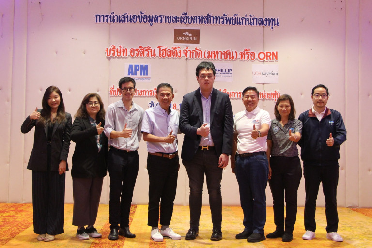 บุญเลิศ บูรณุปกรณ์ ประธานกรรมการบริหาร ปรีดิกร บูรณุปกรณ์ ประธานเจ้าหน้าที่บริหาร อรรคเดช อุดมศิริธำรง กรรมการบริหาร บริษัท อรสิริน โฮลดิ้ง จำกัด (มหาชน) (ORN) สมภพ ศักดิ์พันธ์พนม ประธานกรรมการ สุพล ค้าพลอยดี กรรมการผู้จัดการ บริษัท แอสเซท โปร แมเนจเม้นท์ จำกัด (APM) ที่ปรึกษาทางการเงิน วชิราภรณ์ วศธรรมสิทธิ์ ผู้อำนวยการฝ่ายสถาบัน บริษัทหลักทรัพย์ ฟิลลิป (ประเทศไทย) จำกัด (มหาชน) (PST) ในฐานะผู้จัดจำหน่ายและรับประกันการจำหน่าย ร่วมนำเสนอข้อมูลรายละเอียดหลักทรัพย์ ศักยภาพการเติบโตของ ORN เพื่อสร้างความเชื่อมั่นให้กับนักลงทุน ก่อนเสนอขายหุ้นสามัญเพิ่มทุนให้กับประชาชนเป็นครั้งแรก (IPO) จำนวน 406.5 ล้านหุ้น ณ โรงแรมเดอะพาร์ค พิษณุโลก จ.พิษณุโลก
