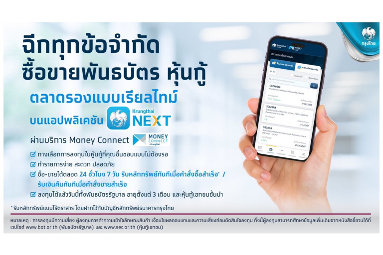 ธนาคารกรุงไทยเปิดตัวบริการซื้อขายหุ้นกู้เอกชนและพันธบัตรรัฐบาลตลาดรองแบบเรียลไทม์ ผ่านบริการ Money Connect บนแอปฯ Krungthai NEXT ส่งเสริมผู้ลงทุนรายย่อยเข้าถึงการลงทุนอย่างทั่วถึง สะดวก และปลอดภัย นำร่องซื้อขายหุ้นกู้ของ 3 บริษัทในเอสซีจี เริ่มซื้อขายแล้ววันนี้