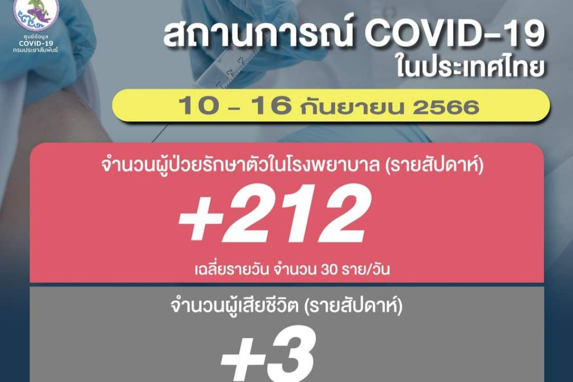 วันที่ 18 ก.ย.2566 ศูนย์ข้อมูล COVID-19 กรมประชาสัมพันธ์ รายงานสถานการณ์โรคโควิด-19 รายสัปดาห์ เกาะติดยอดผู้ติดเชื้อโควิด-19 รายสัปดาห์ ระหว่างวันที่ 10 กันยายน - 16 กันยายน 2566 พบผู้ป่วยรักษาตัวในโรงพยาบาล (รายสัปดาห์) จำนวน 212 ราย : เฉลี่ยรายวัน จำนวน 30 ราย/วัน ผู้เสียชีวิต (รายสัปดาห์) จำนวน 3 ราย : เฉลี่ยรายวัน จำนวน 1 ราย/วัน ทั้งนี้พบยอดป่วยสะสม 33,131 ราย (ตั้งแต่ 1 มกราคม 2566)เสียชีวิตสะสม 802 ราย (ตั้งแต่ 1 มกราคม 2566)