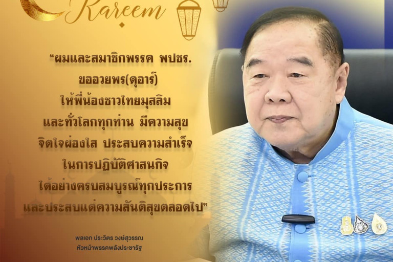 “ผมและสมาชิกพรรค พปชร. ขออวยพร(ดุอาร์)ให้พี่น้องชาวไทยมุสลิมและทั่วโลกทุกท่าน มีความสุข จิตใจผ่องใส ประสบความสำเร็จในการปฏิบัติศาสนกิจได้อย่างครบสมบูรณ์ทุกประการและประสบแต่ความสันติสุขตลอดไป”