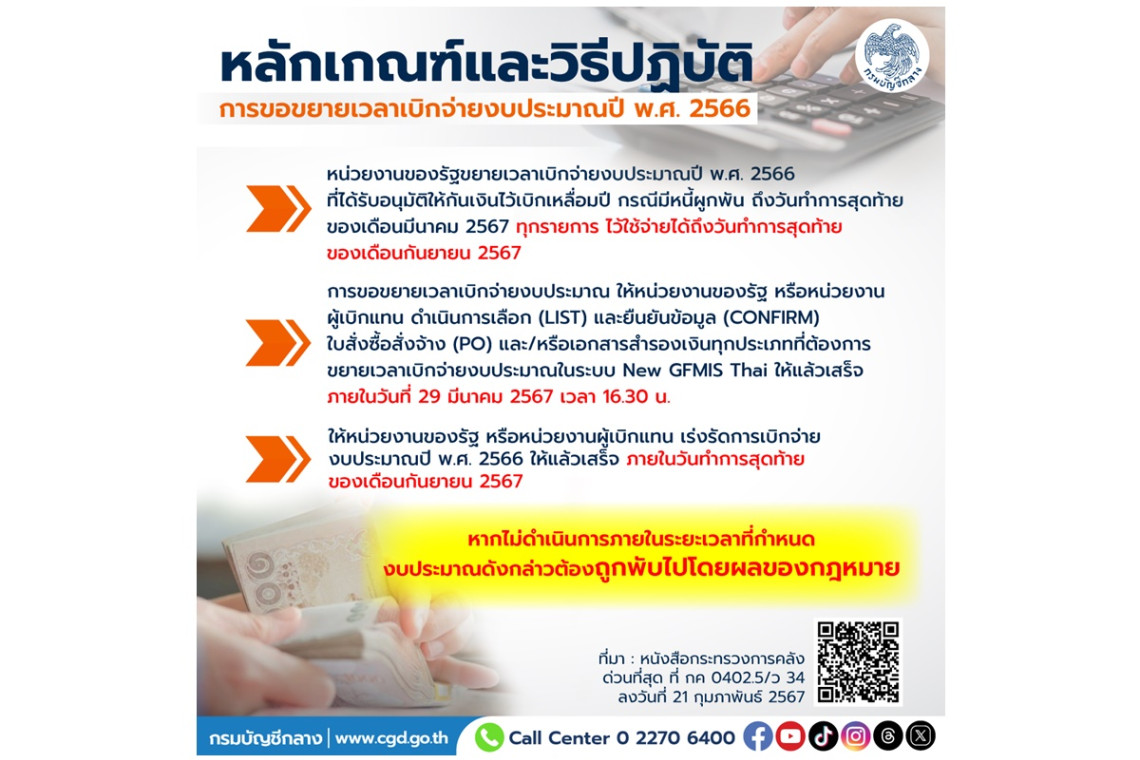 กรมบัญชีกลางออกหลักเกณฑ์และวิธีปฏิบัติในการขอขยายเวลาเบิกจ่ายเงินปี 66 เพื่อให้เม็ดเงินเข้าสู่ระบบเศรษฐกิจได้อย่างรวดเร็ว