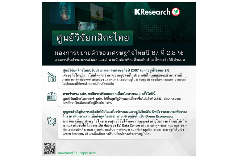 ทั้งนี้เศรษฐกิจไทยปี 2567 มีแนวโน้มโตต่ำกว่าคาด โดยศูนย์วิจัยกสิกรไทยได้ปรับลดประมาณการเติบโตของเศรษฐกิจไทยปี 2567 ลงมาอยู่ที่ 2.8% จาก 3.1% จากอุปสงค์ในประเทศที่โมเมนตัมยังแผ่วลง รวมถึงภาคการผลิตที่ยังหดตัวต่อเนื่อง และหนี้ครัวเรือนที่อยู่ในระดับสูง สะท้อนได้จากยอดขายรถยนต์ในประเทศที่ยังหดตัวหลายเดือนติดต่อกัน ในปี 2567 เศรษฐกิจไทยจะได้รับแรงหนุนจากการกลับมาเบิกจ่ายงบประมาณของภาครัฐบาลและการส่งออกสินค้าที่คาดว่าขยายตัว 2% และจำนวนนักท่องเที่ยวต่างชาติที่มีโอกาสโตถึง 36 ล้านคนในปีนี้ ศูนย์วิจัยกสิกรไทยคาดว่า ธปท.ได้สิ้นสุดวัฏจักรดอกเบี้ยขาขึ้นไปแล้วที่ 2.5% และ ธปท.มีแนวโน้มจะลดดอกเบี้ยประมาณ 2 ครั้งในปี 2567 นี้ ส่วนประมาณการอัตราเงินเฟ้อของปีอยู่ที่ระดับ 0.8%