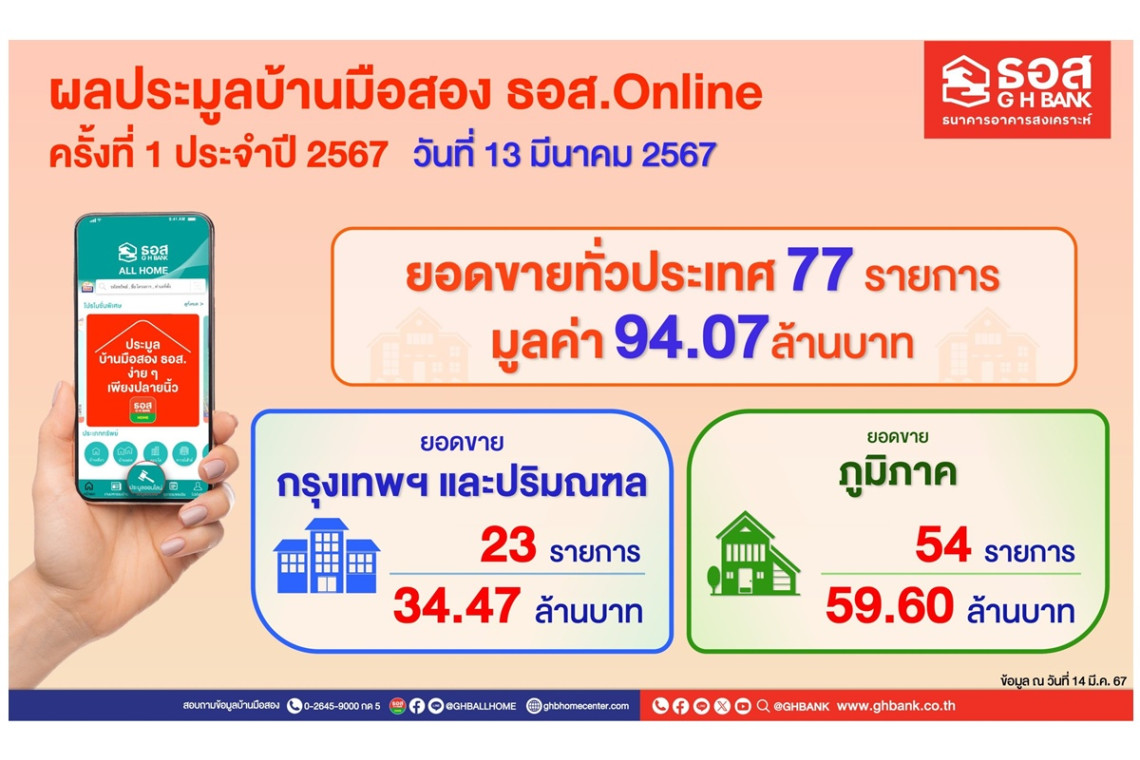 ธนาคารอาคารสงเคราะห์ (ธอส.) เปิดเผยผลการจัด “งานประมูลบ้านมือสอง ธอส. ออนไลน์ ครั้งที่ 1 ประจำปี 2567” ซึ่งจัดขึ้นพร้อมกันทั่วประเทศ ผ่าน Application : GHB ALL HOME เมื่อวันพุธที่ 13 มีนาคม 2567 ระหว่าง เวลา 12.00-12.30 น. สามารถจำหน่ายบ้านมือสองได้จำนวน 77 รายการ คิดเป็นมูลค่า 94.07 ล้านบาท แบ่งเป็น
