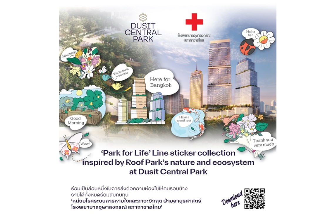 คุณละเอียด โควาวิสารัช ประธานเจ้าหน้าที่บริหาร บริษัท วิมานสุริยา จำกัด ผู้พัฒนาโครงการ Dusit Central Park กล่าวว่า “ด้วยเจตนารมณ์ของโครงการฯ ที่มุ่งมั่นพัฒนาในทุกมิติ ตั้งแต่การพัฒนาโครงการด้วยความรับผิดชอบต่อสังคมและสิ่งแวดล้อมของชุมชน Dusit Central Park เล็งเห็นถึงปัญหาสิ่งแวดล้อม ทำให้เราต้องการเป็นส่วนหนึ่งในการส่งเสริมสุขภาพประชาชนและคุณภาพเมืองไปพร้อมกัน จึงได้ออกแบบพื้นที่สีเขียว Roof Park ซึ่งเป็นหัวใจสำคัญของการพัฒนาโครงการฯ เพื่อพัฒนาที่ดินทำเลดีที่สุดของกรุงเทพฯ สู่พื้นที่สีเขียวที่มอบระบบนิเวศ (Ecosystem) และนิเวศเมือง (Urban Ecology) อย่างยั่งยืน ส่งมอบประโยชน์คืนสู่สาธารณะ ไลน์สติกเกอร์เพื่อการกุศล “Park for Life” นี้เพื่อเป็นโครงการเชื่อมโยงระหว่าง โครงการ-ชุมชน-ประชาชน เข้าด้วยกัน ทั้งนี้ ทุกยอดดาวน์โหลดจากผู้ร่วมทำบุญโดยไม่หักค่าใช้จ่ายใดๆ ทาง Dusit Central Park จะนำส่งถึงหน่วยโรคระบบการหายใจและภาวะวิกฤต ฝ่ายอายุรศาสตร์ โรงพยาบาลจุฬาลงกรณ์ สภากาชาดไทย”