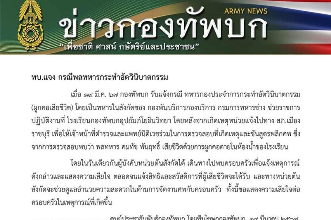 ทบ.แจง กรณีพลทหารกระทำอัตวินิบาตกรรม