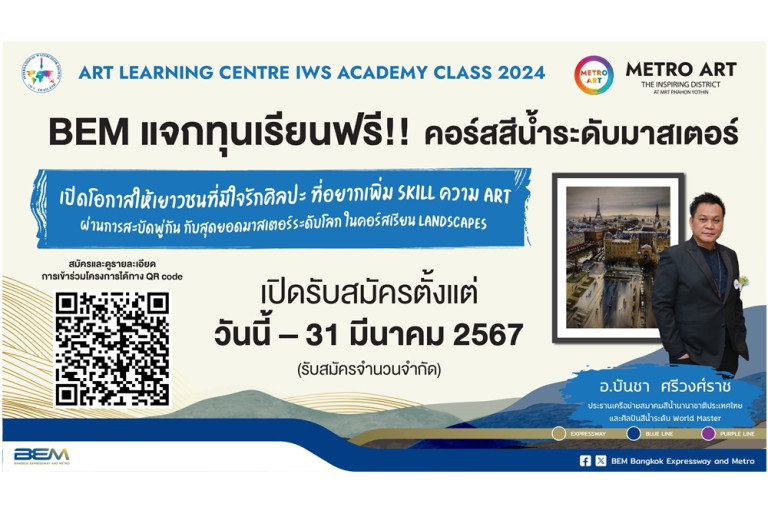 บริษัท ทางด่วนและรถไฟฟ้ากรุงเทพ จำกัด (มหาชน) หรือ BEM ร่วมกับ เครือข่ายสมาคมสีน้ำโลก IWS ประเทศไทย (International Watercolor Society) มอบโอกาสให้น้องๆเยาวชนนักเรียนระดับชั้นมัธยมศึกษาปีที่ 1 – 6 ที่มีใจรักศิลปะ ต้องการเพิ่มทักษะฝีมือโดยไม่เสียค่าใช้จ่าย ทั้งยังได้สร้าง Portfolio สำหรับเข้าศึกษาต่อในระดับมหาวิทยาลัย ด้วยคอร์สเรียน “Basic Watercolor Landscapes การวาดภาพทิวทัศน์ สีน้ำขั้นพื้นฐาน” ศึกษาเทคนิคการวาดภาพสีน้ำตั้งแต่ระดับพื้นฐาน (Basic)จนถึงระดับแอดวานซ์ (Advanced) ด้วยความรู้แบบจัดเต็มจากศิลปินระดับมาสเตอร์ที่ได้รับการรับรองจาก IWS THAILAND พร้อมใบประกาศมาสเตอร์คลาส (Course Certificate)